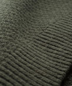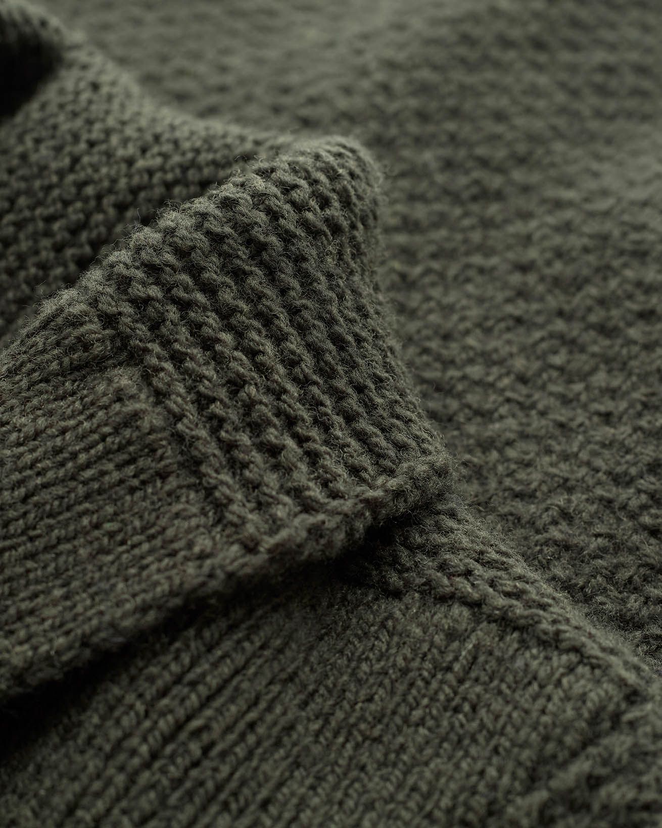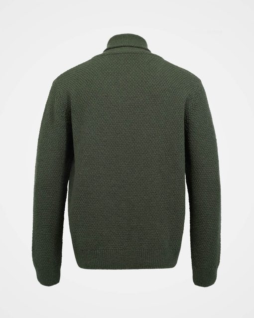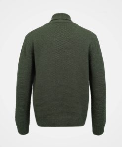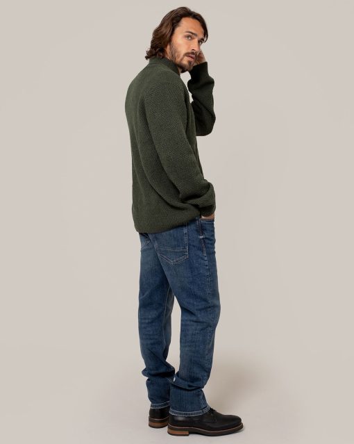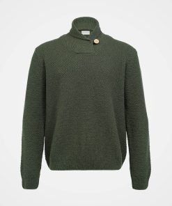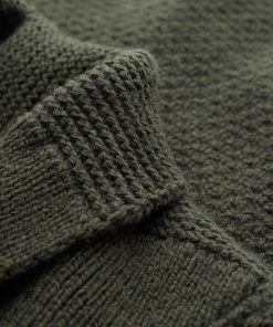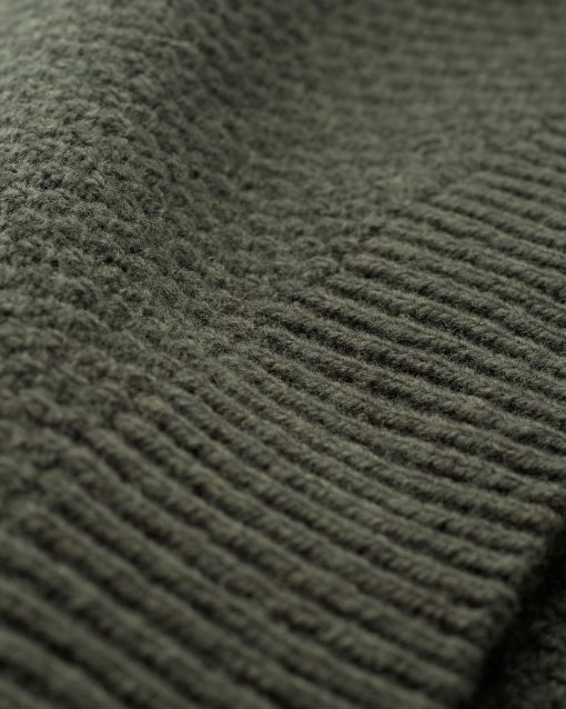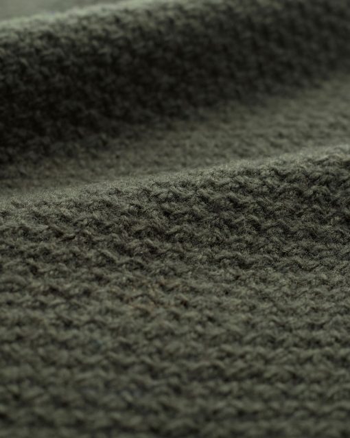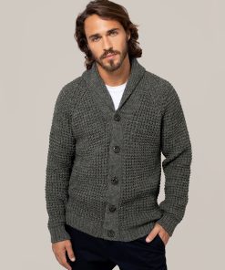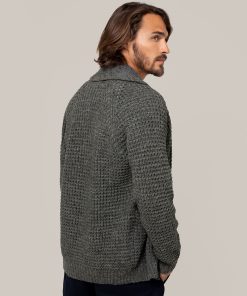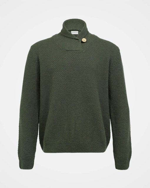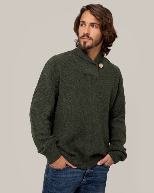 Our men’s jumper features a buttoned shawl collar and a distinctive moss stitch pattern. Crafted from Italian wool which has been saved from incineration, it offers both warmth and responsible sourcing.