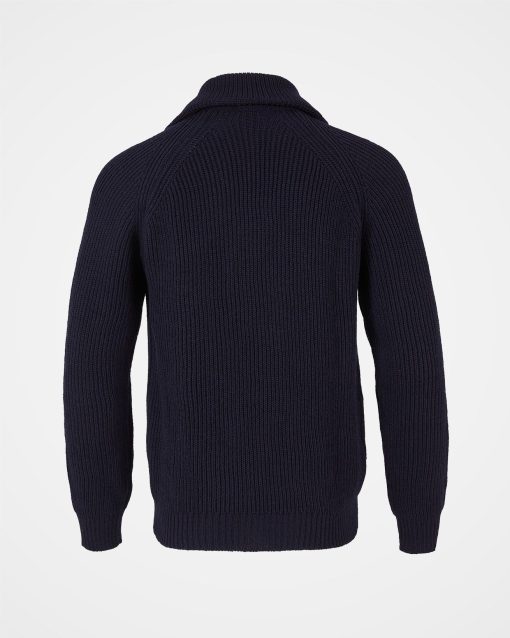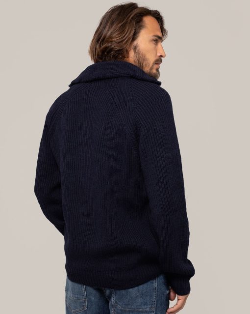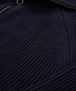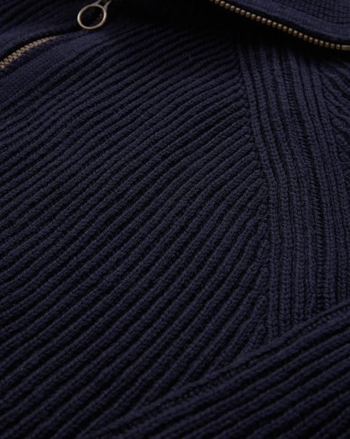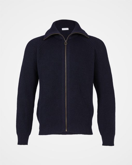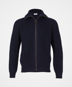 The ultimate in all-season layering, this zip-through style is knitted in pure Merino with a chunky rib structure that will keep its structure through wash and wear. The funnel collar can be zipped all the way up or folded down, and the antique-effect brass zipper adds extra interest through the centre front.