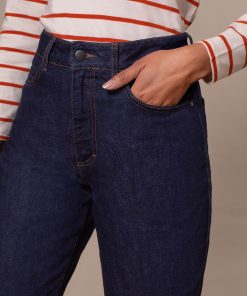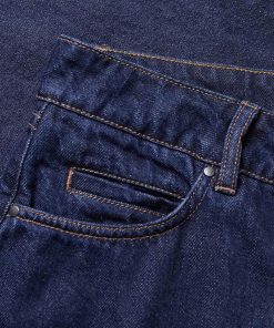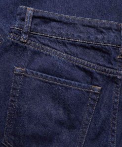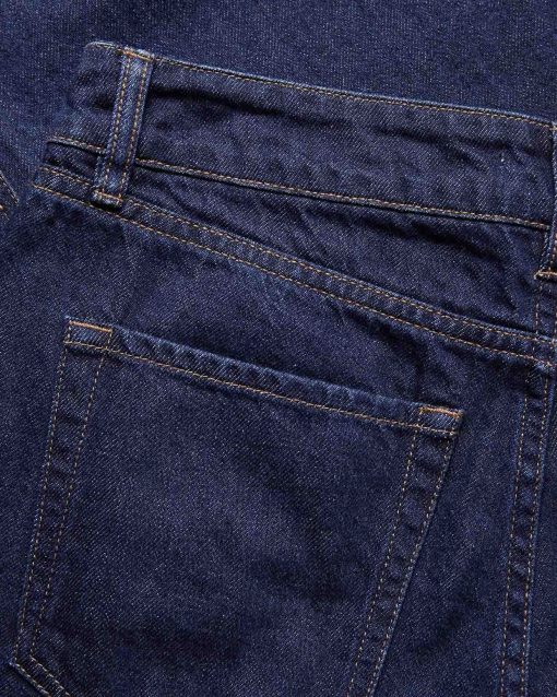 Indigo denim in a classic, non-stretch weave. The garment has been washed to reveal varied shades of blue, adding depth and character to the fabric.
