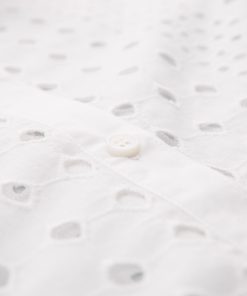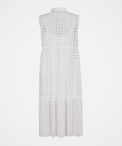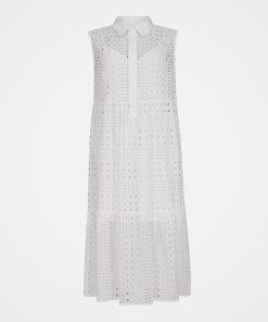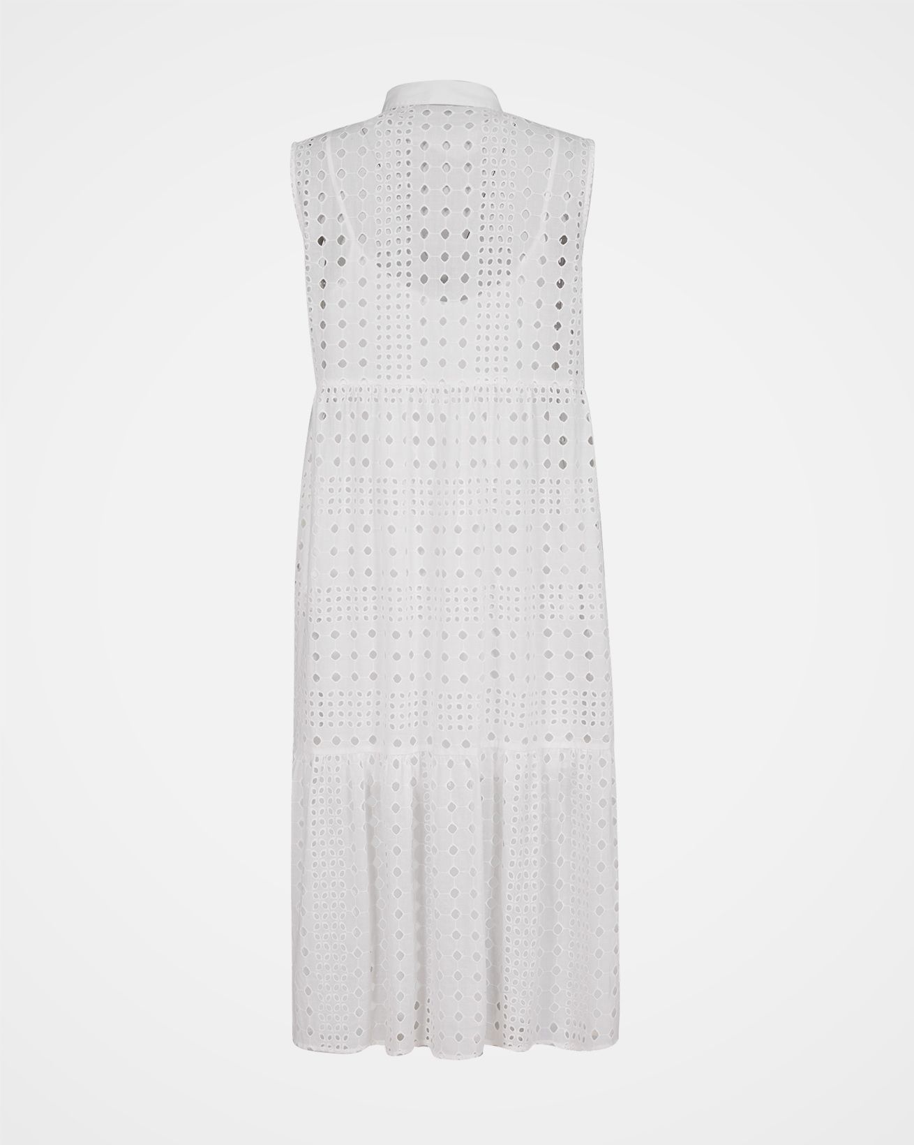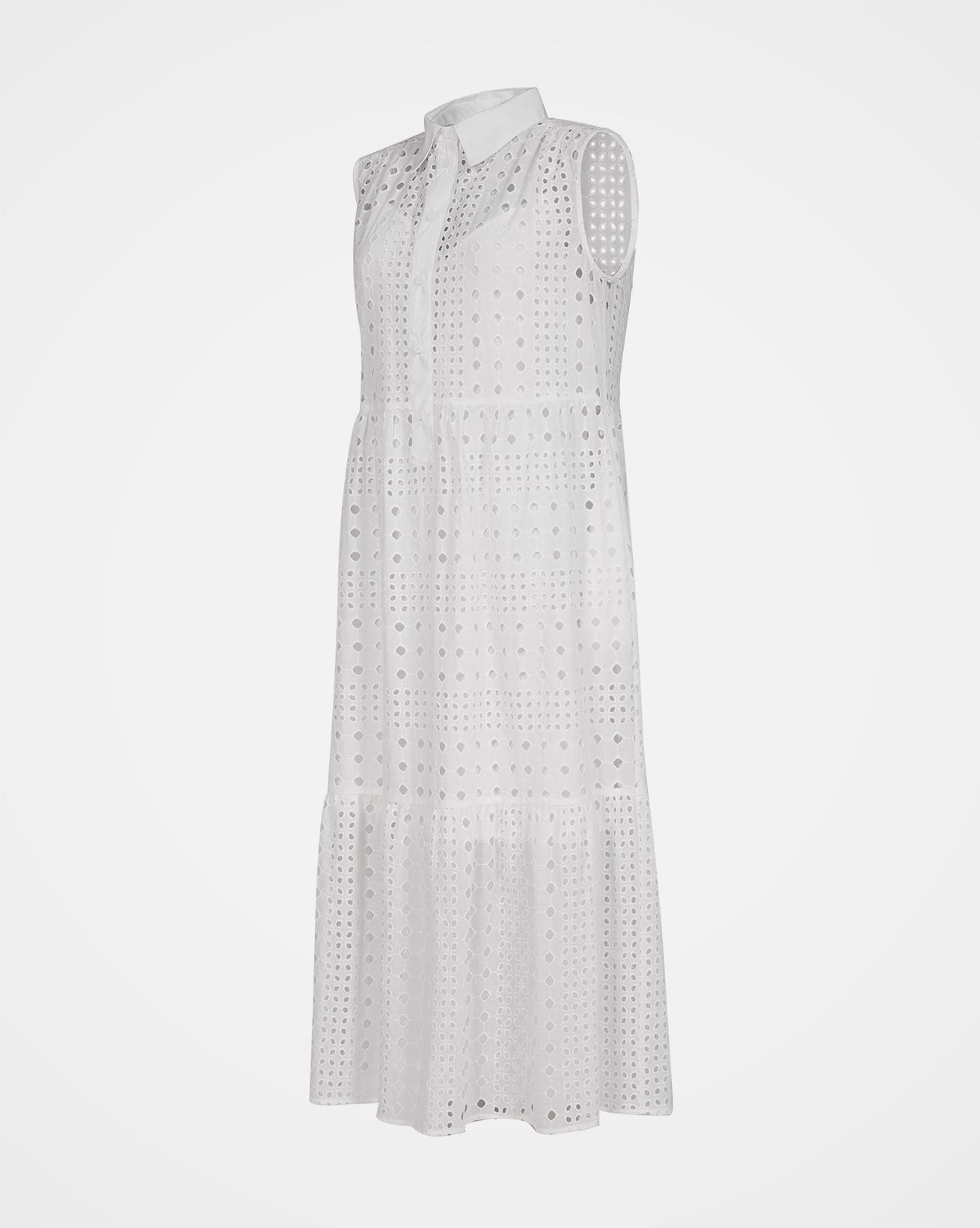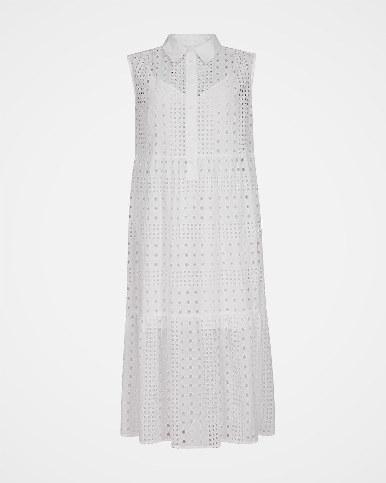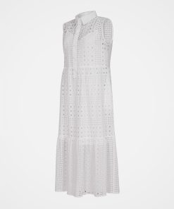 Perfectly on trend, our beautiful Broderie Sleeveless Maxi Dress has a flowing, tiered silhouette and a gathered waist. The broderie cutwork fabric of the outer layer creates a sheer appearance, and the dress is lined with a shorter cotton cami dress. The collar and placket are made in plain contrast cotton.