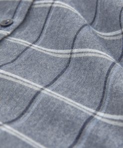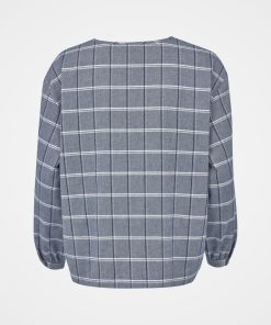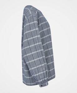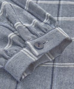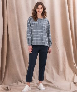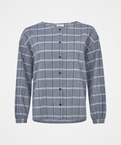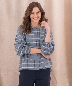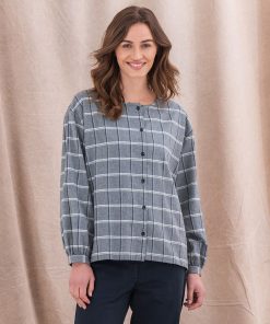 With a soft, flannel finish and in a light windowpane check fabric, this easy-to-wear shirt is collarless and has a pretty, wide crew neckline. Finished in a button-through style with natural Corozo buttons, it has a drop shoulder shape. The long sleeves have a soft fullness through gathering into the seam, and the cuffs are narrow and buttoned. Wear with denim and white trainers for casual comfort.