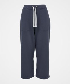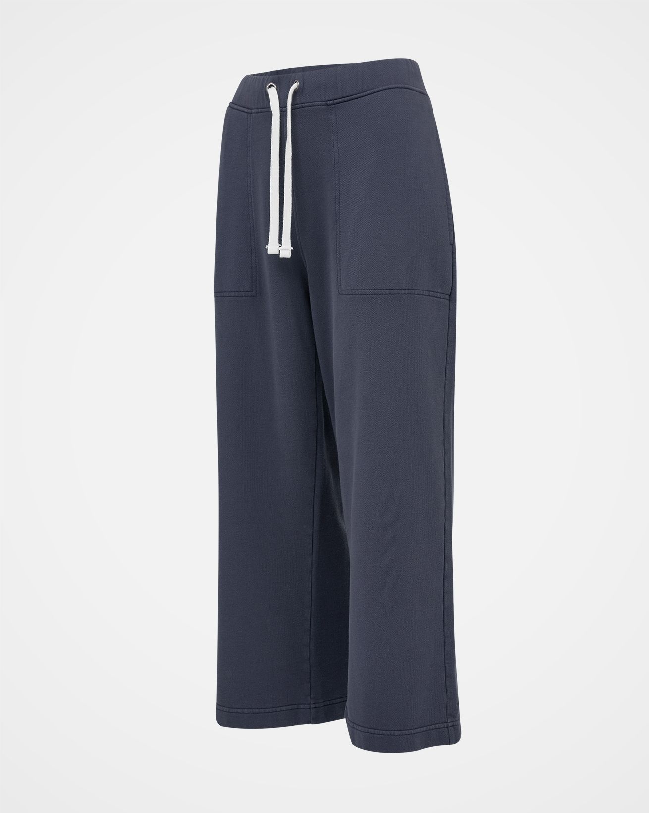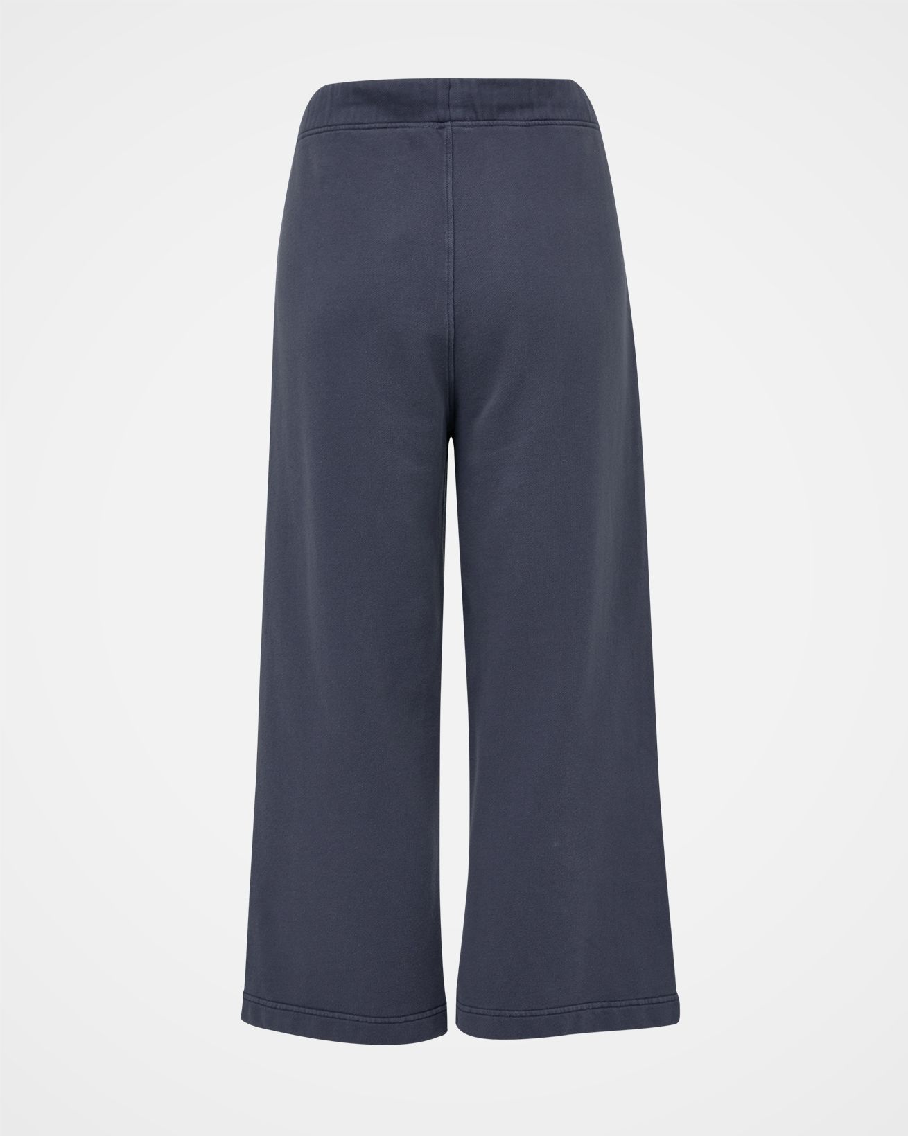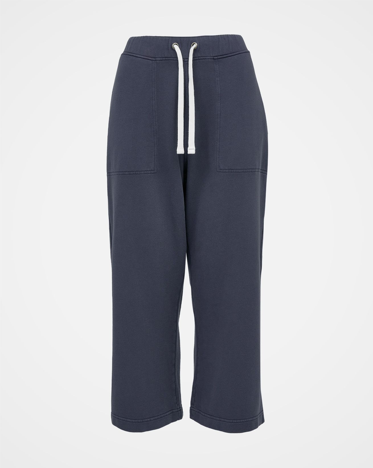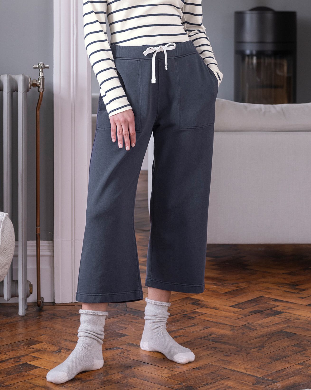 Made in loop back jersey sweatshirting, they have a trendy wide leg that sits at a cropped length. The drawstring waist features contrast ecru cotton tape ties. Pockets in the side seam add comfort and practicality.