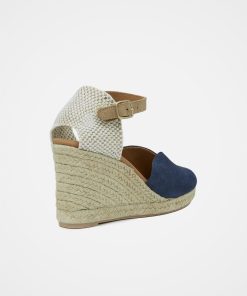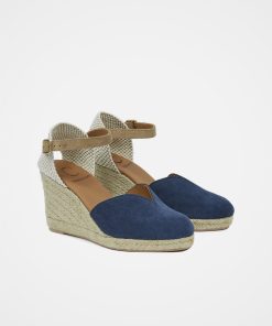 Step out in style with our Ankle Strap Wedge Espadrille. This elegant wedge heel espadrille shoe is perfect for dressing up or down. The plaited jute finish around the sole and heel is complemented by a rubber outsole. Featuring an enclosed toe with curved notched detail, comprised of suede and lined in vegetable-tanned leather .The back strap is comprised of a typical woven espadrille heel panel and a suede ankle strap, fastened with a metal buckle.