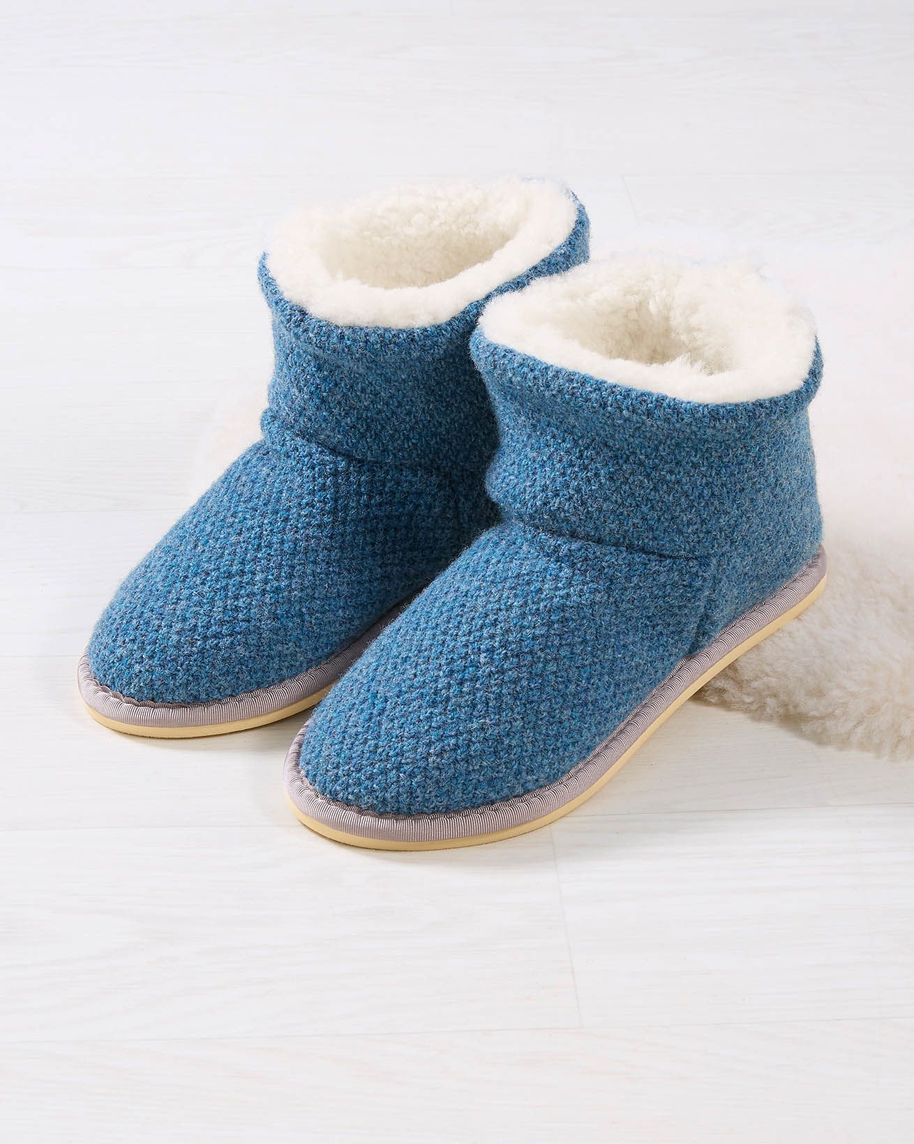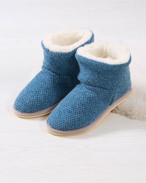 Pad around the house in luxurious cosiness with our knitted shortie slippers. These sweet boots are crafted with a textured lambswool outer and a fluffy sheepskin inner, encasing your feet in plush softness as you go about your chores (or simply put your feet up).