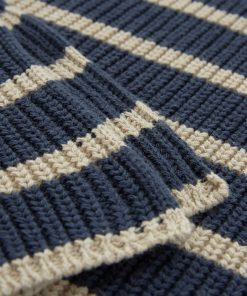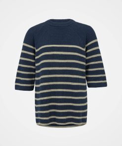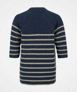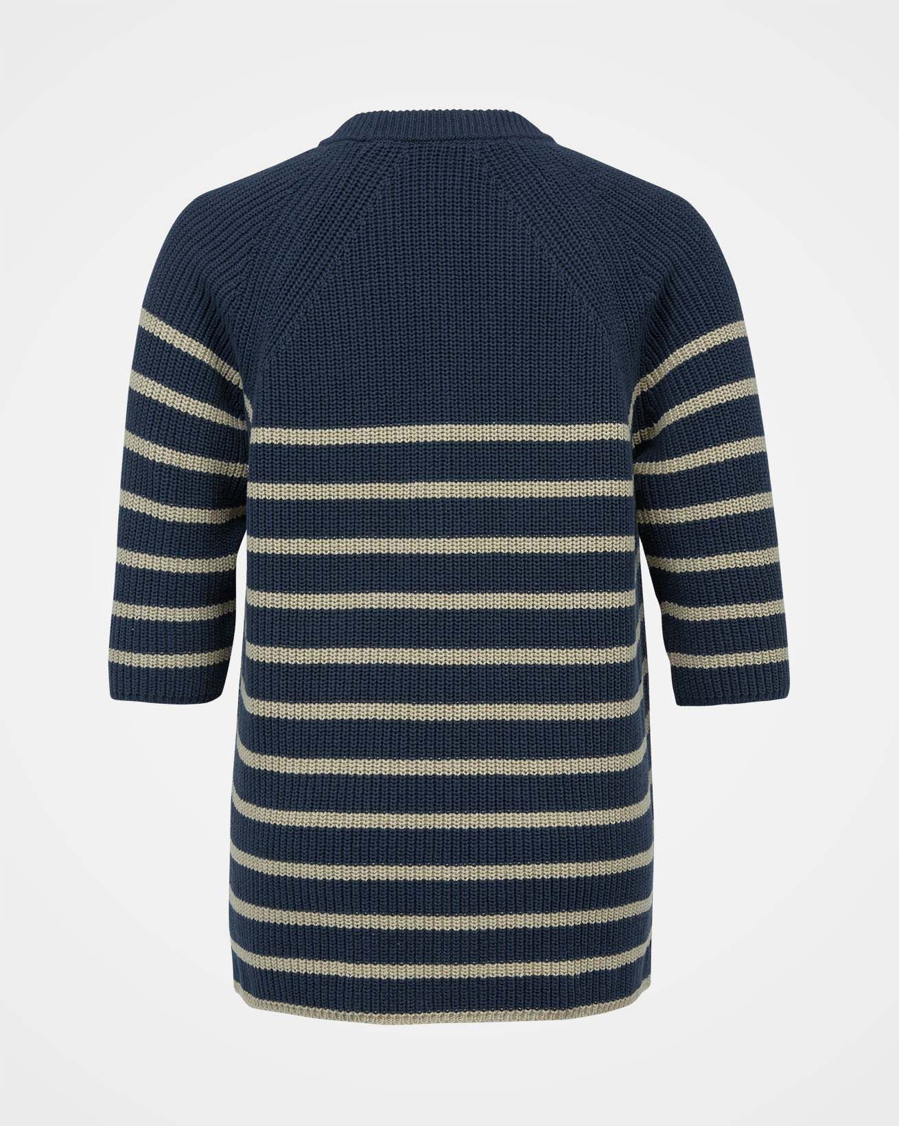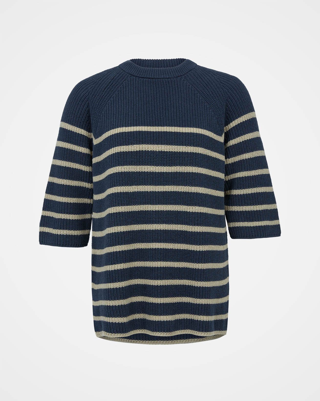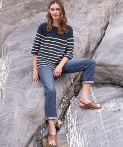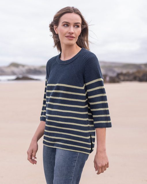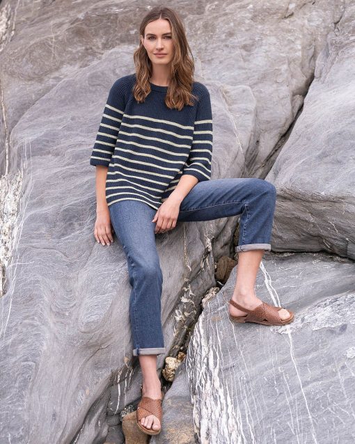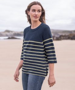 This versatile half sleeve jumper is made from summery yarn, knitted in a half cardigan stitch to add substance and drape to the shape and style. Featuring a crew neckline and a side splits at the hem, this has a modern and clean look with classic Breton striping.