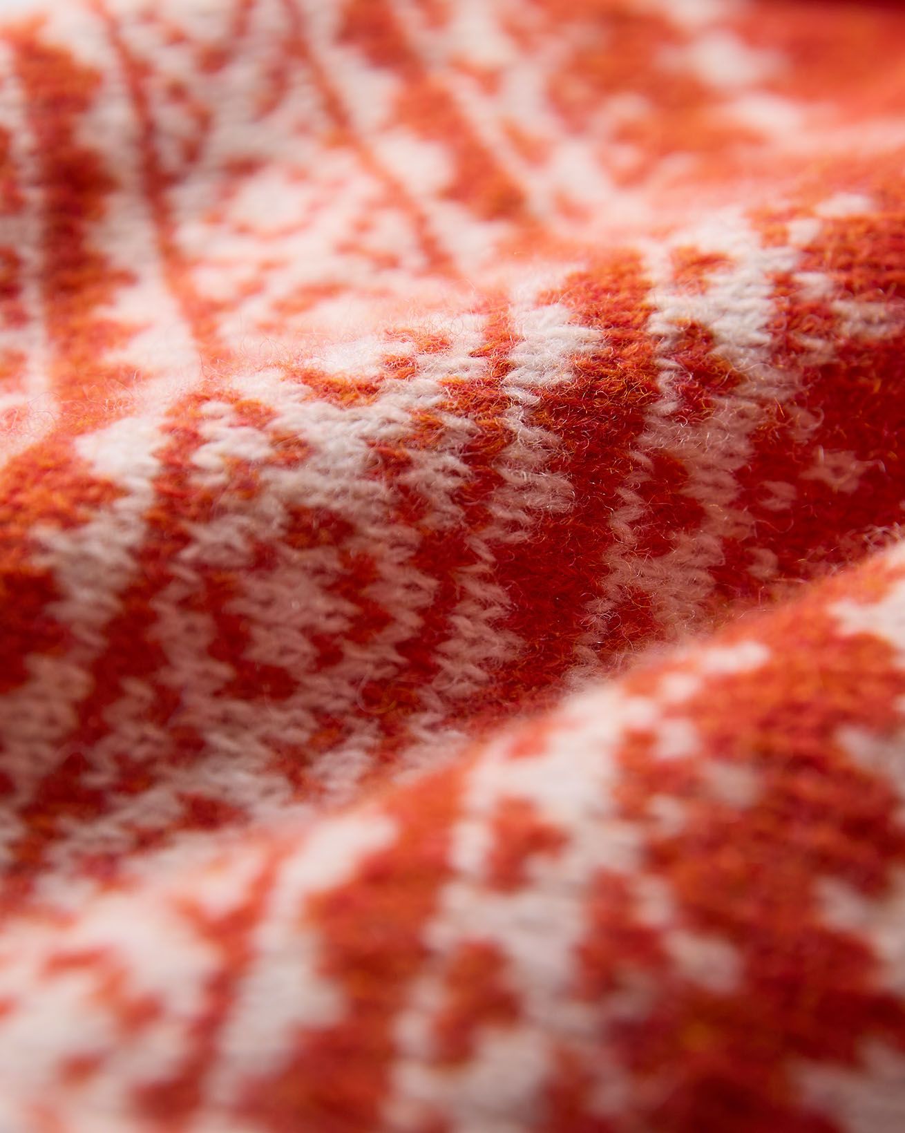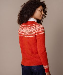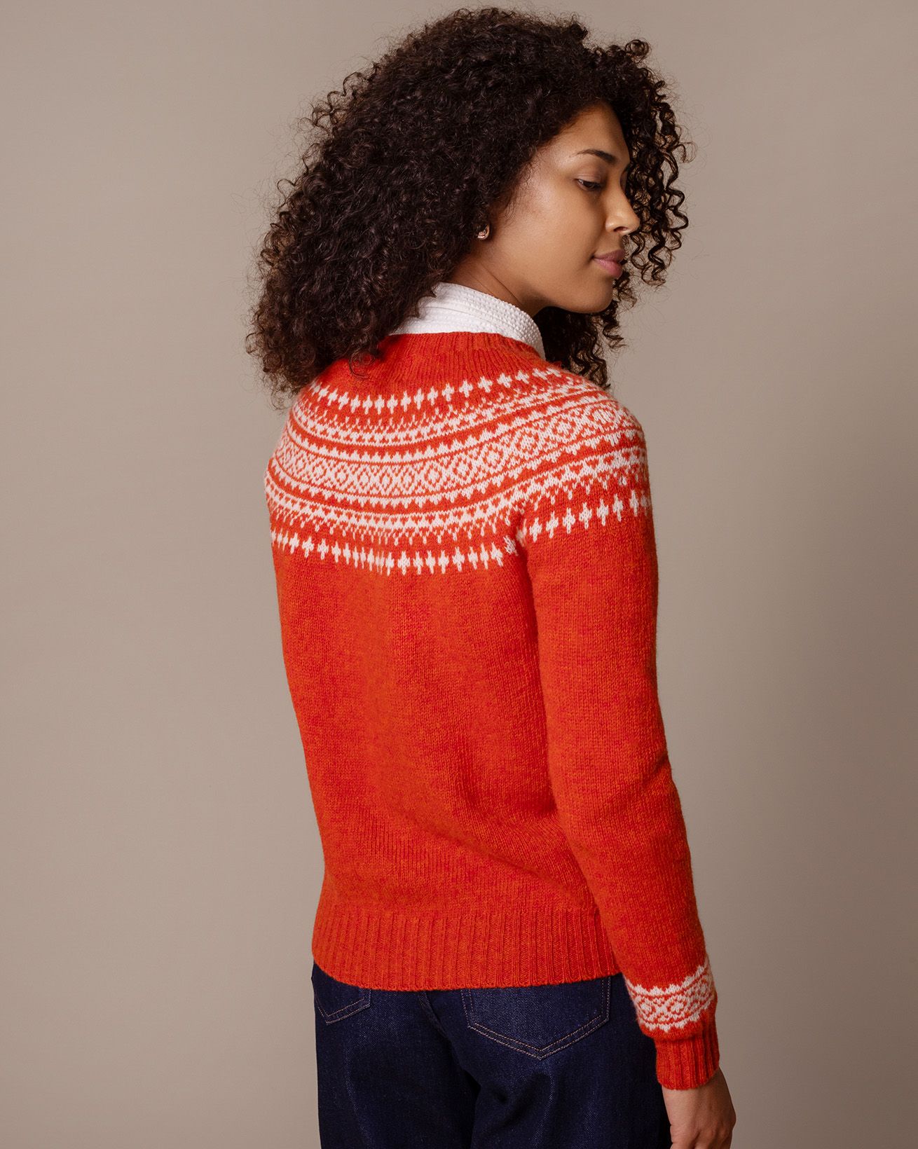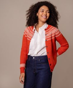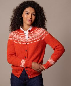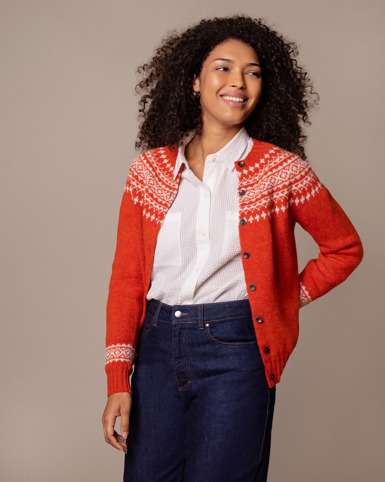 Made in Britain by Harley of Scotland, this Fair Isle cardigan is crafted from pure new wool and features a two-colour yoke design. With a crew neckline, neat fit, ribbed hems, and UK-made corozo buttons, it blends traditional craftsmanship with everyday wearability.