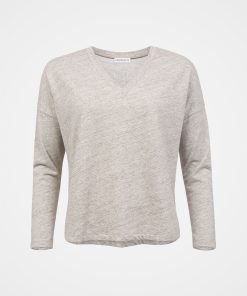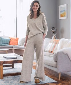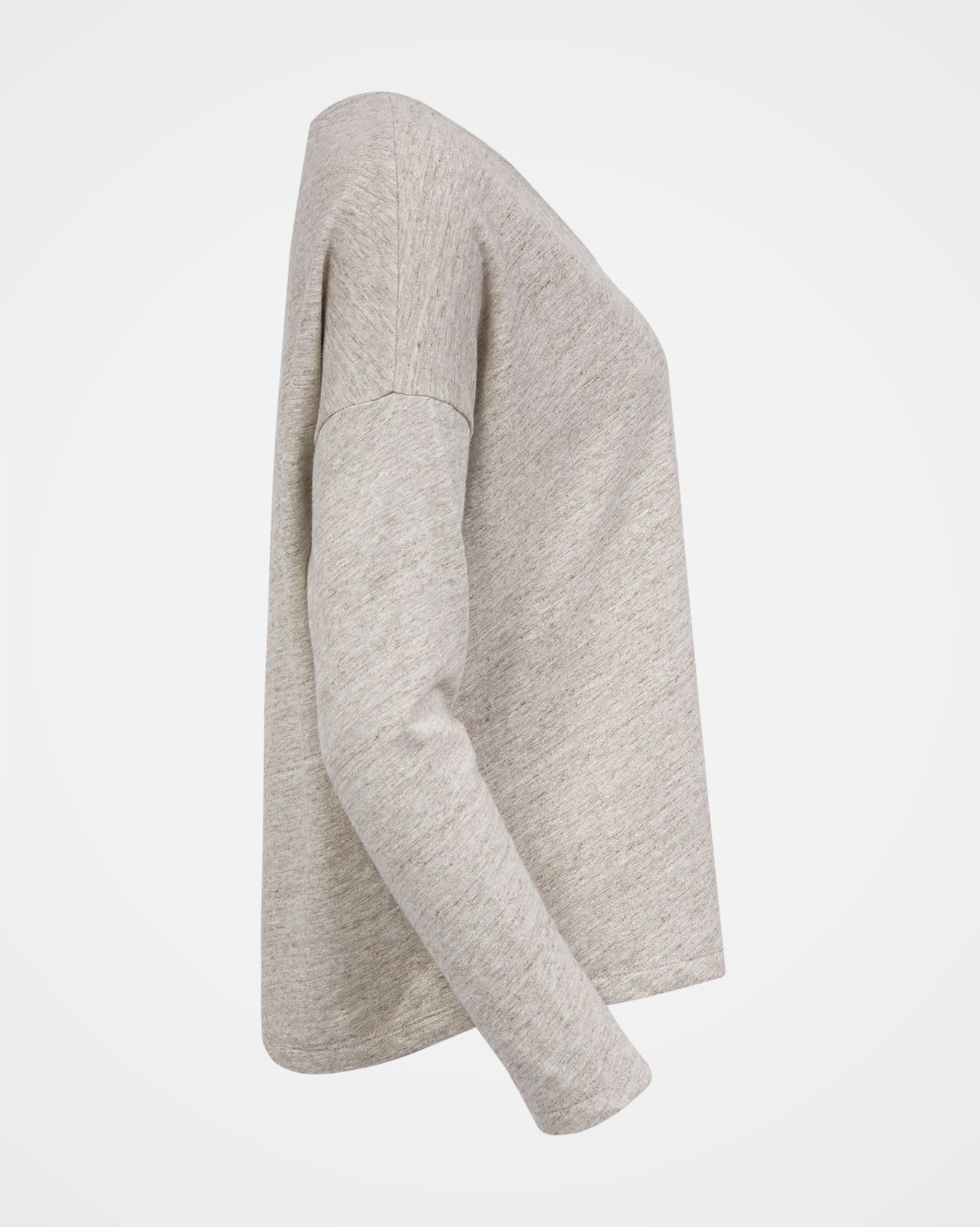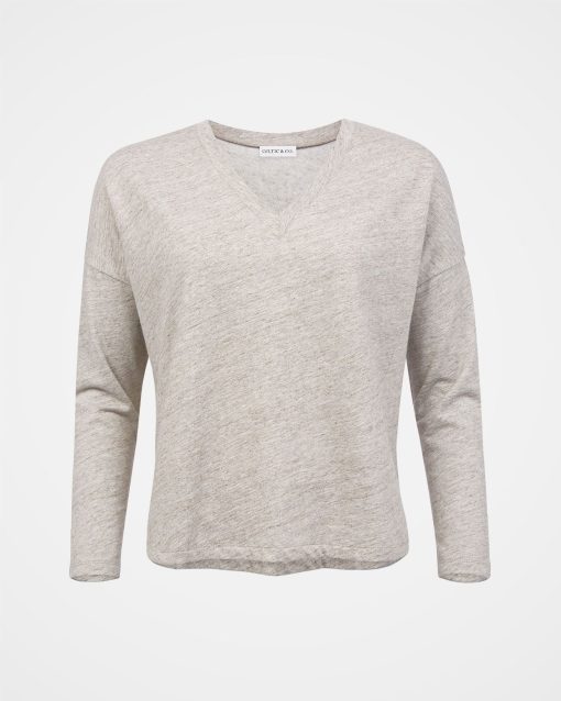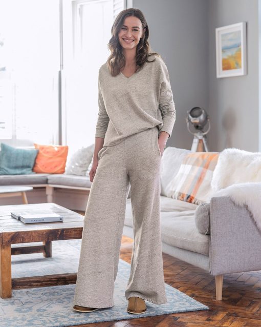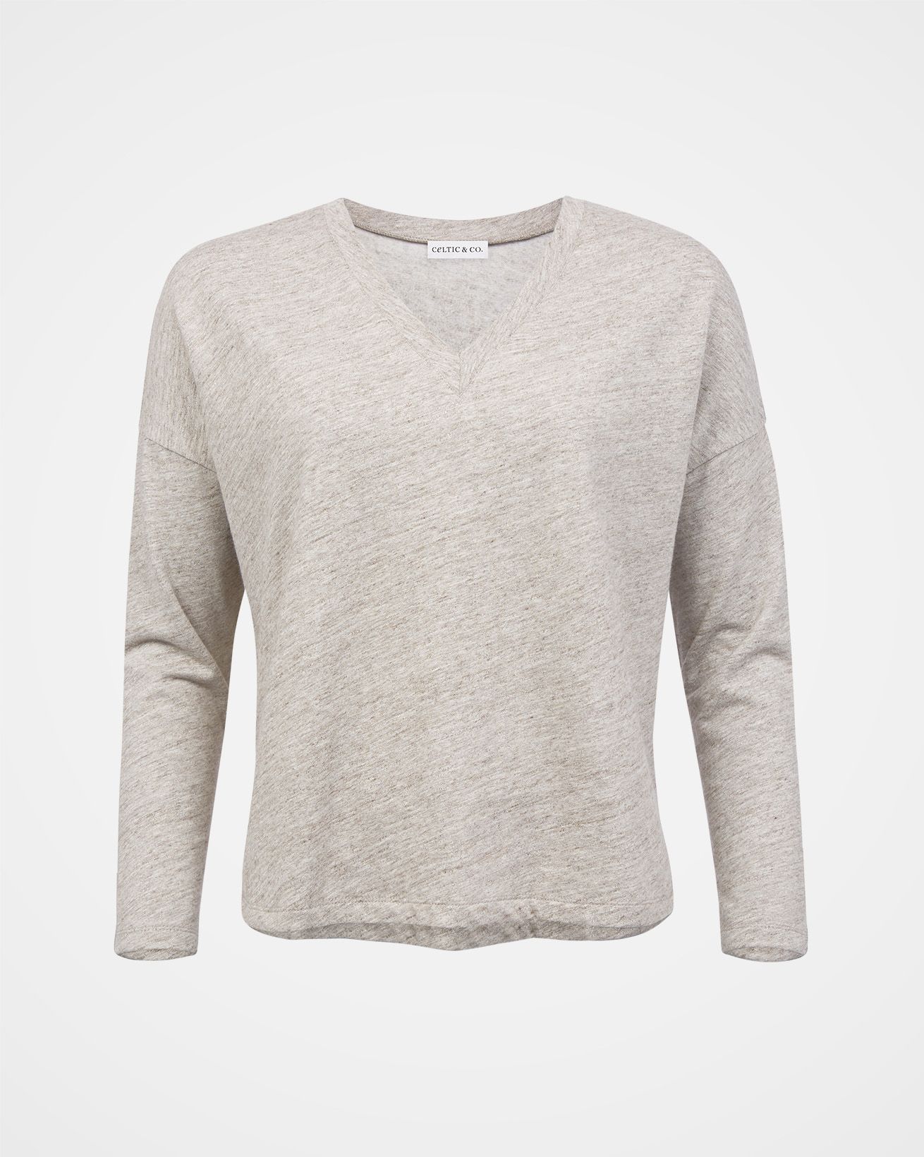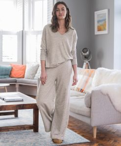 Made from melange, brushed back sweatshirt material, this super cosy jersey V-neck coordinates exactly with our organic cotton wide leg joggers, or can be paired with rest of the lounge collection. Incredibly comfortable, we’ve designed it with a straight cuff and hem so it’s really easy to wear. Long sleeves will keep you warm on winter nights and it looks stylish worn both at home or out and about.
