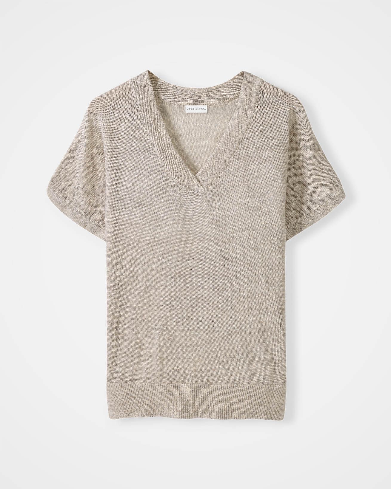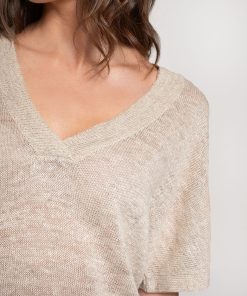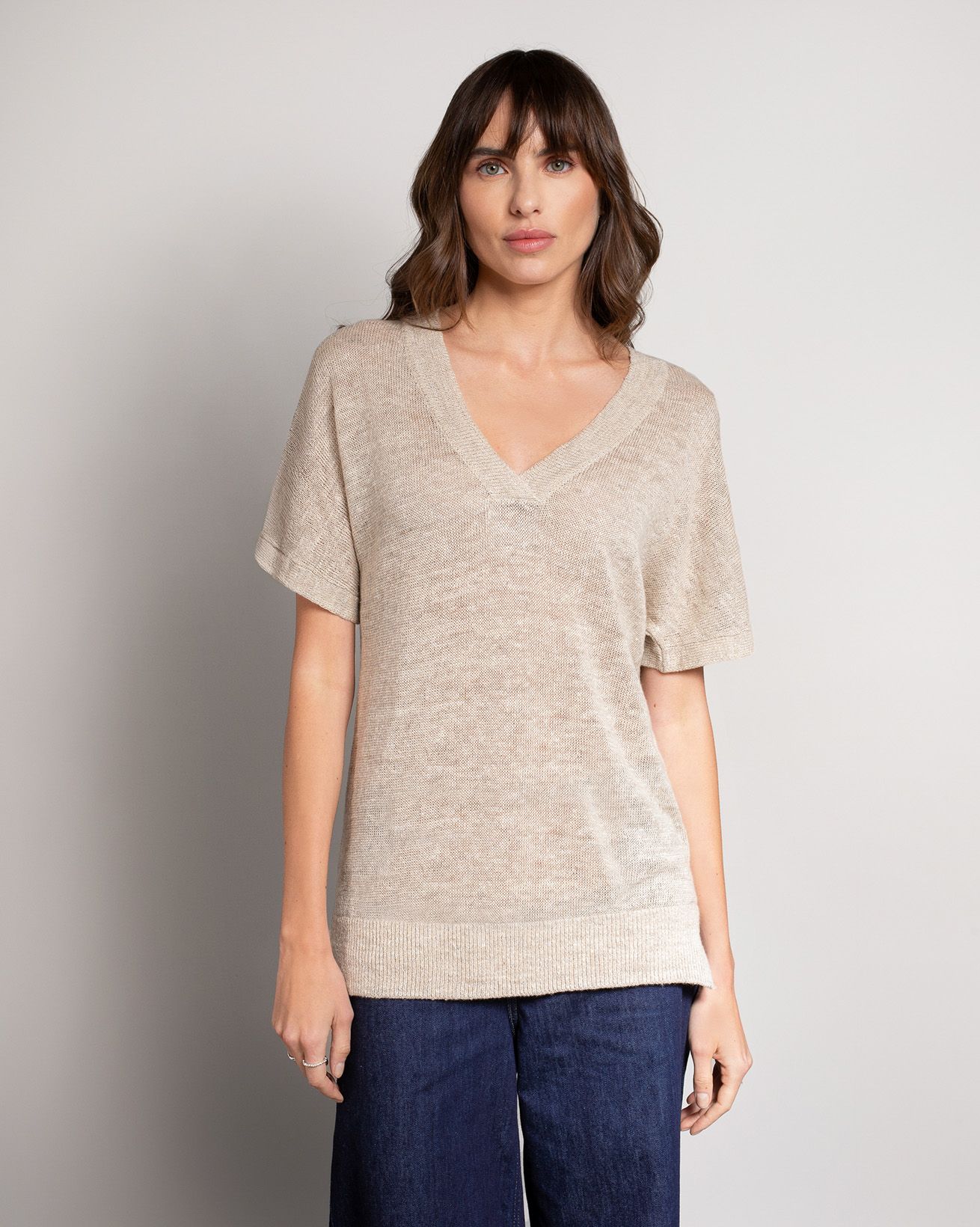 This top combines a relaxed fit with a V neckline and grown-on sleeves for a comfortable silhouette. Ribbed detailing at the collar, hem, and cuffs adds texture, making it an ideal choice for laid-back styling.