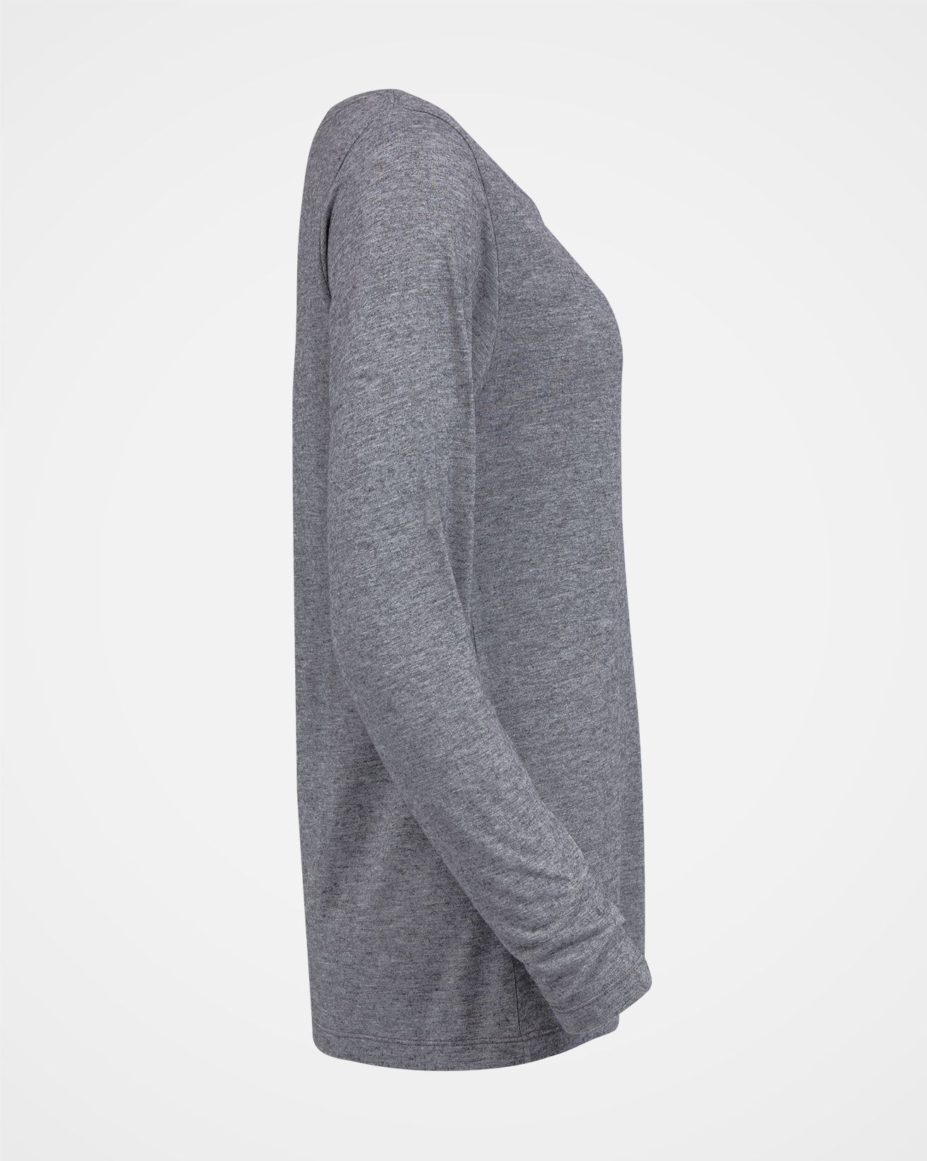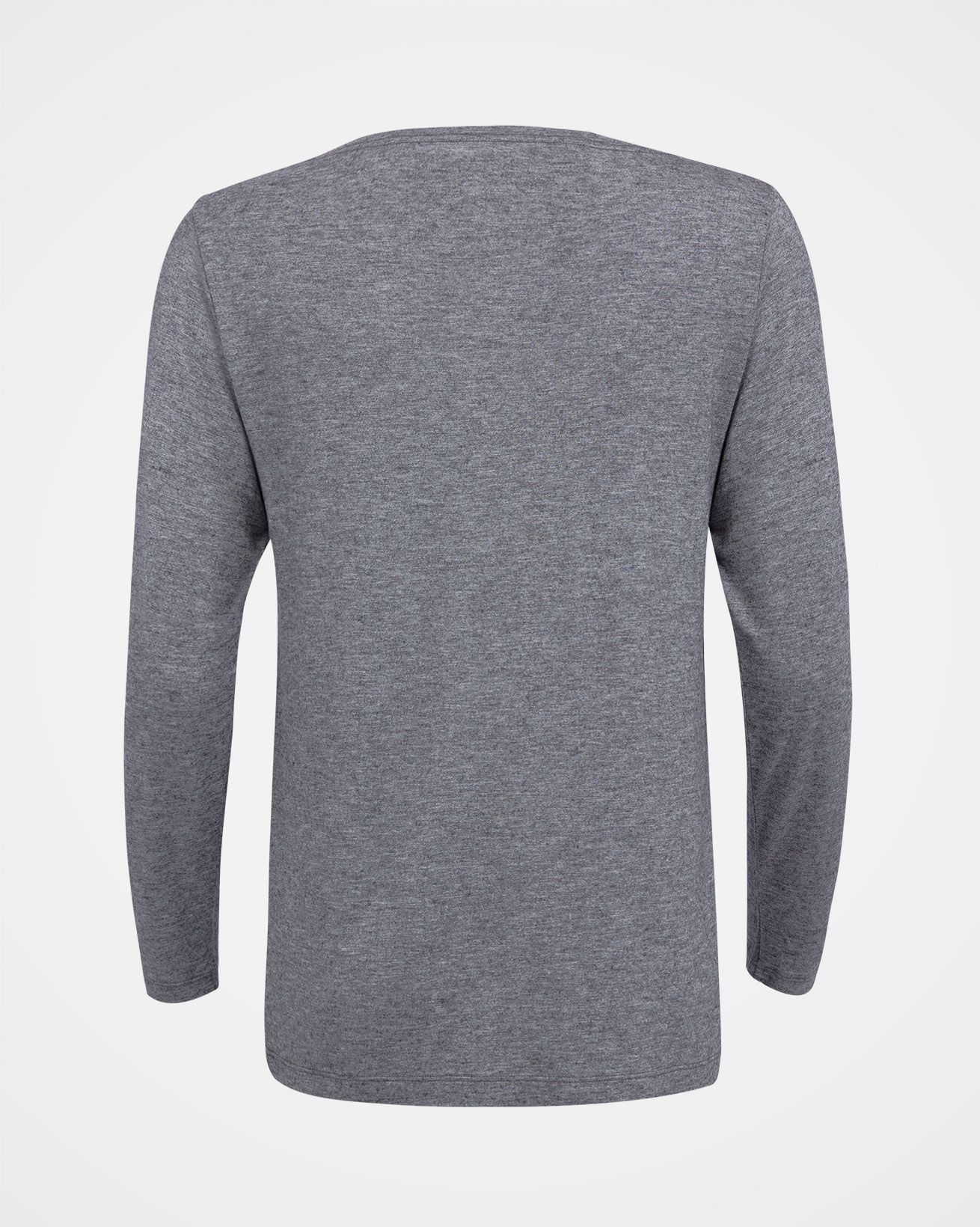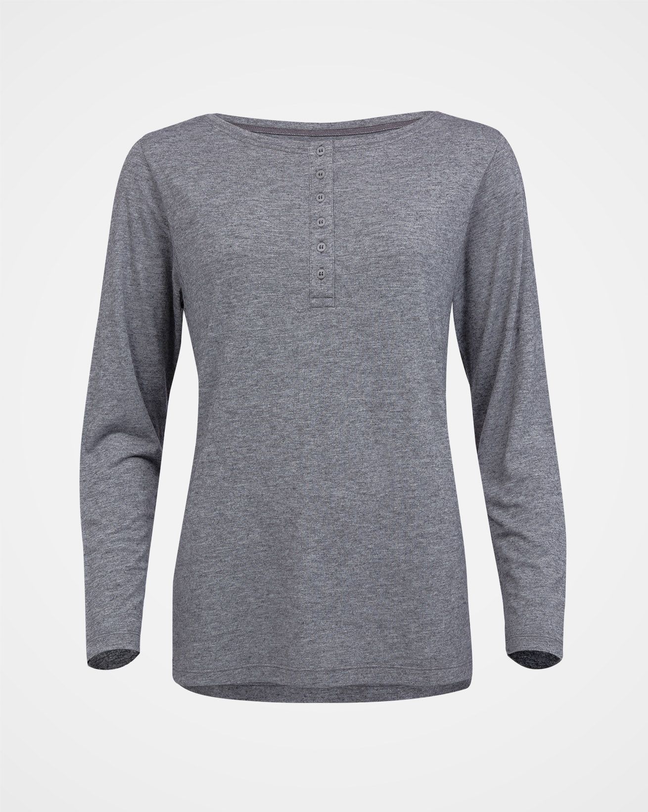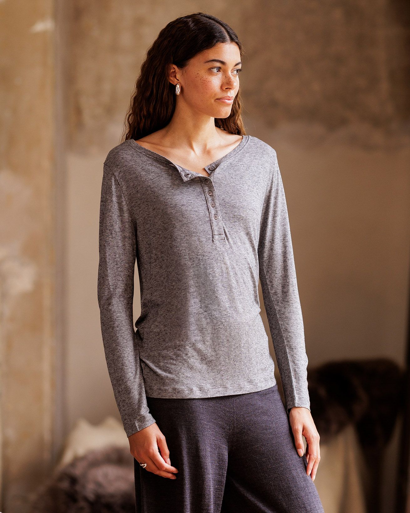 The light jersey of this long sleeved top has a soft and warm handle and drapes beautifully when worn. The classic henley neckline is slightly wider than a crew neck and is very flattering. The pretty button through front placket features natural Corozo buttons. The easy-to-wear jersey style is great for layering with other items or wearing alone. The wool and viscose blend composition gives longevity through the seasons and the top has been garment washed to give it a soft, tumbled look.