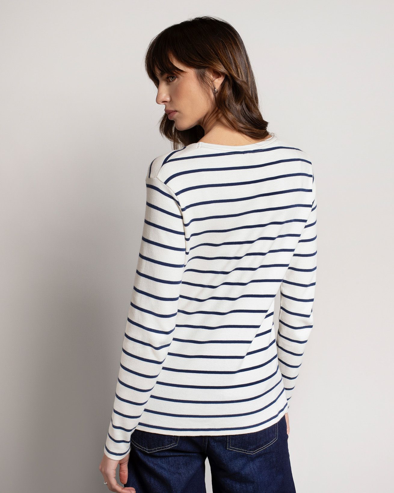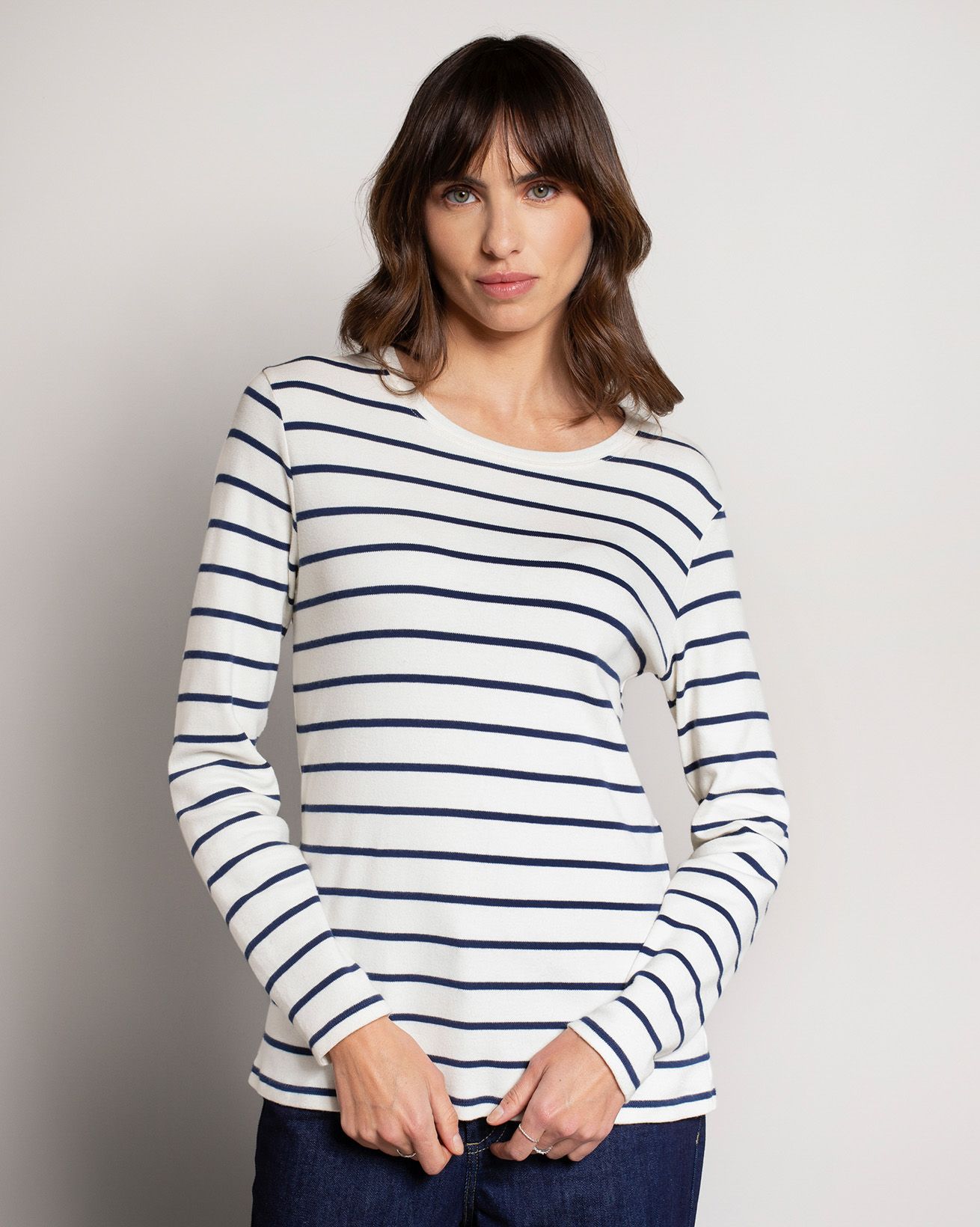 A winter-weight take on the must-have Breton jersey, created in skin-kind, planet-friendly organic cotton. This long-sleeved style teams a narrow stripe with acrew neckline for bold impact. It’s a failsafe partner to mid-blue denim, but looks equally stylish tucked into a tube skirt or wide-leg trousers.