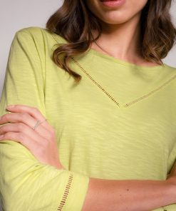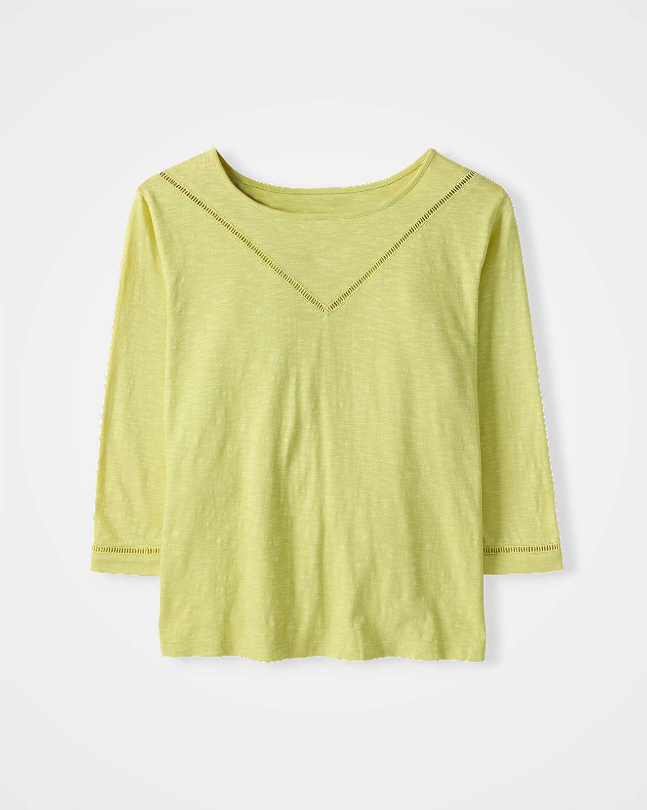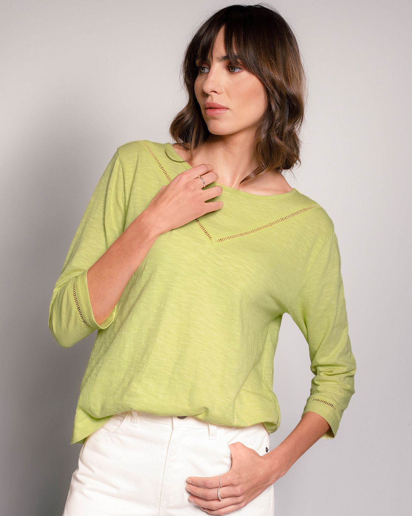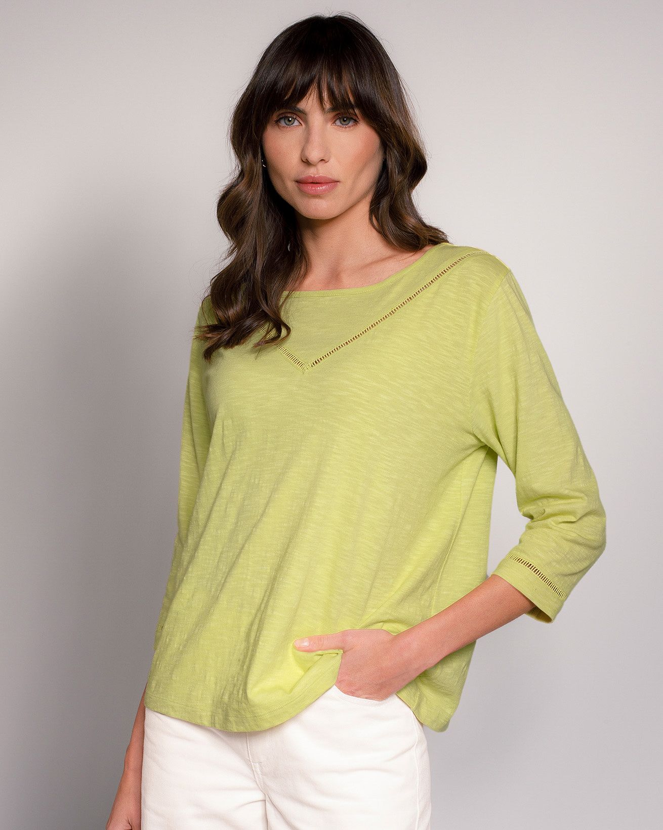 This boat neckline top features a straight fit with 3/4 length sleeves, enhanced by a stylish ladder trim detail. Crafted for comfort, it’s a versatile piece that adds a touch of sophistication to any casual outfit.