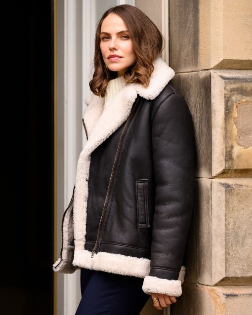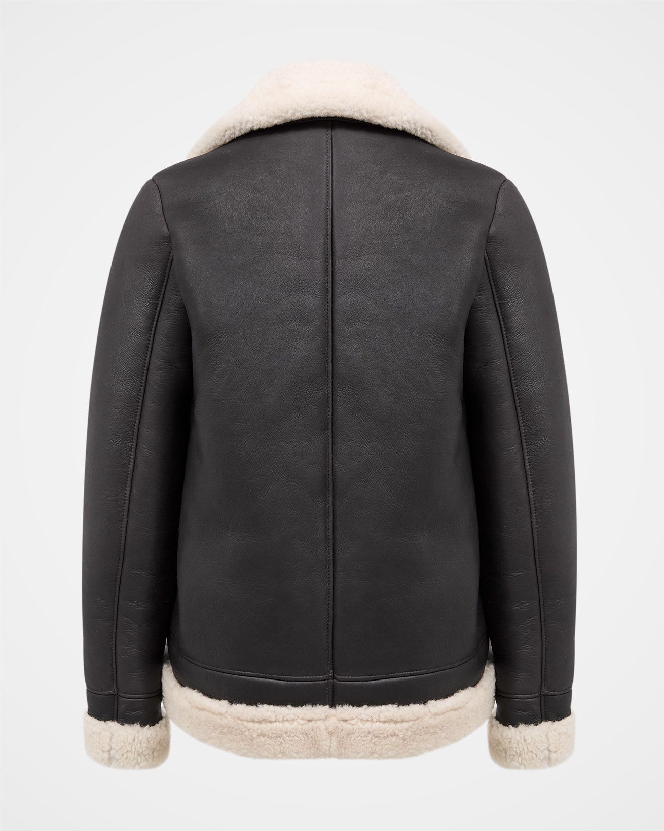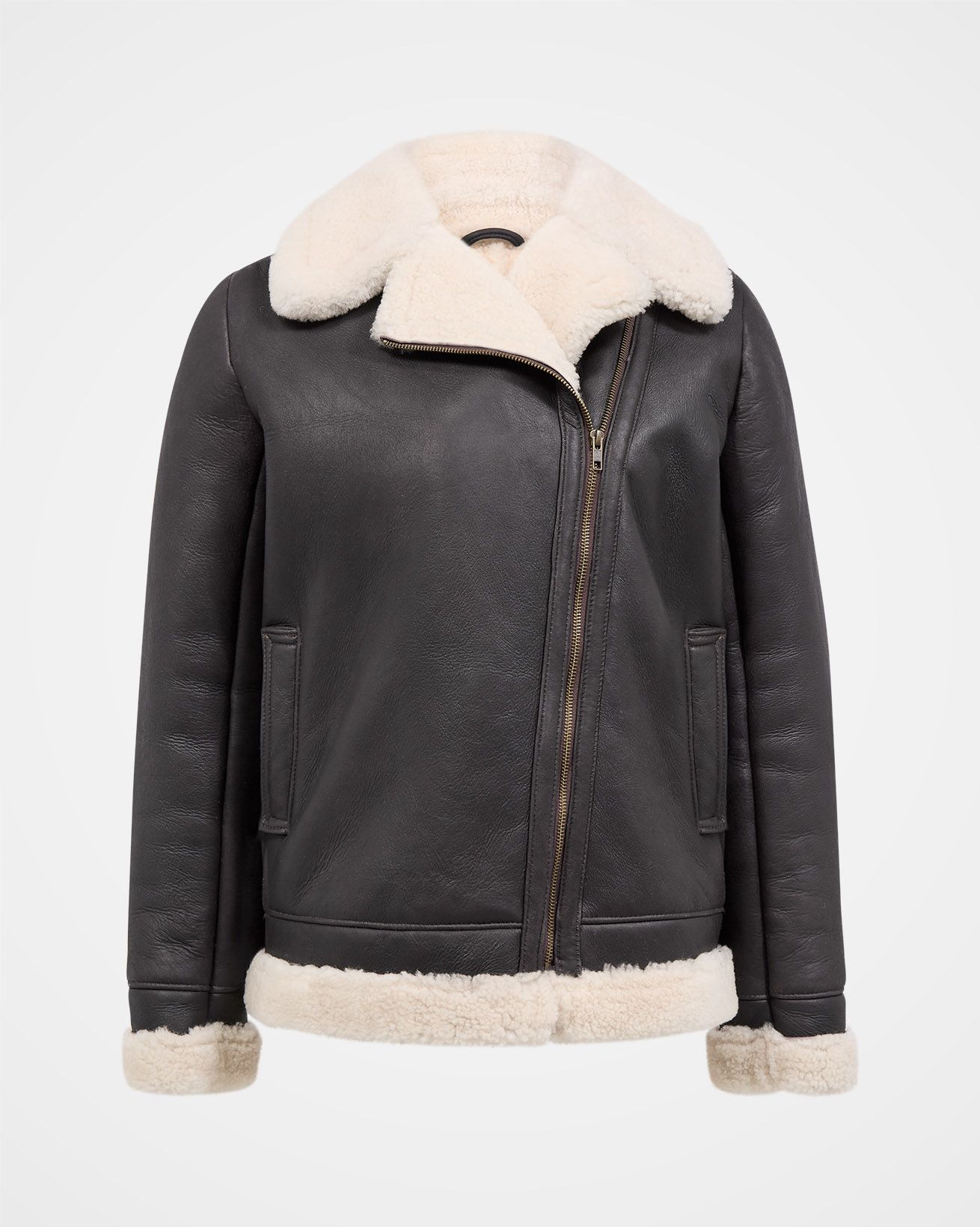 Crafted from luxurious sheepskin, thisjacket offers a contemporary take on biker styling. Boxy fit, contrast leather binding, and zip details add rugged charm.