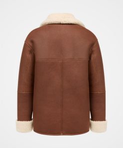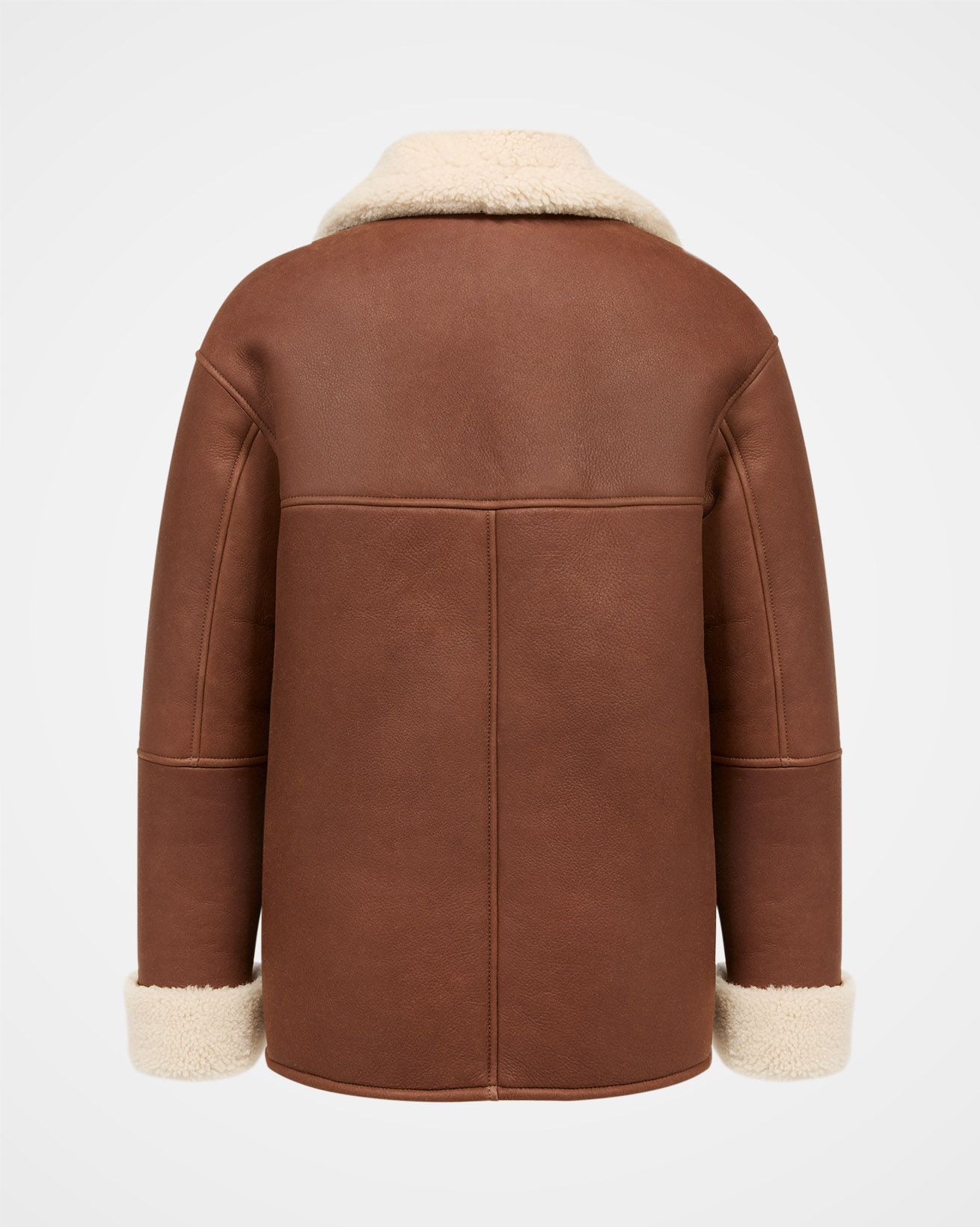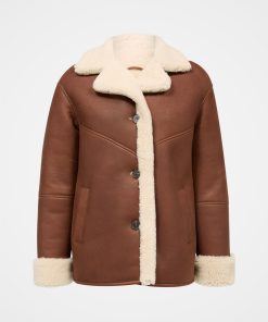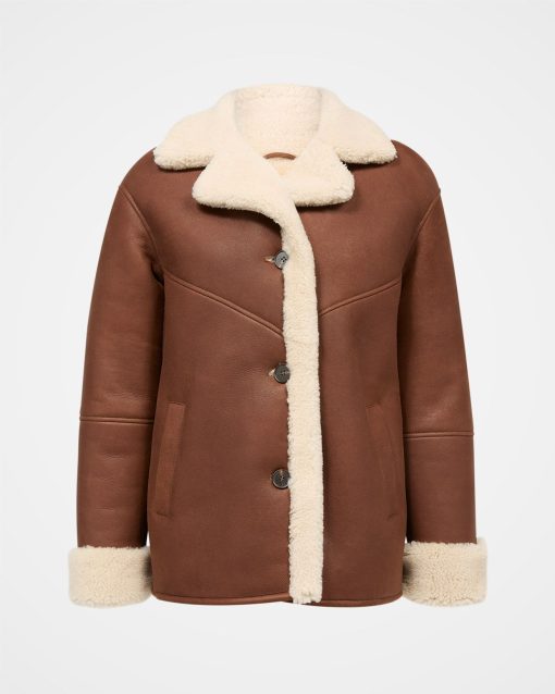 This western-style jacket, crafted from sheepskin, features a collar and revere neckline. The boxy fit is enhanced by distinctive western-style details, horn buttons, and convenient side pockets.