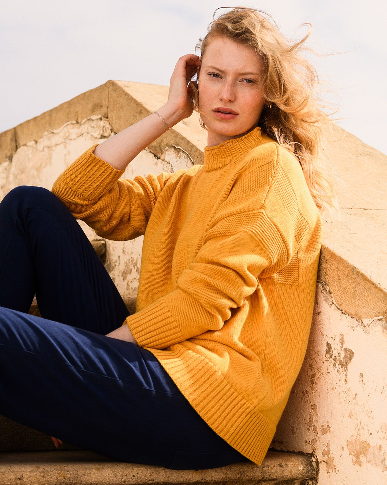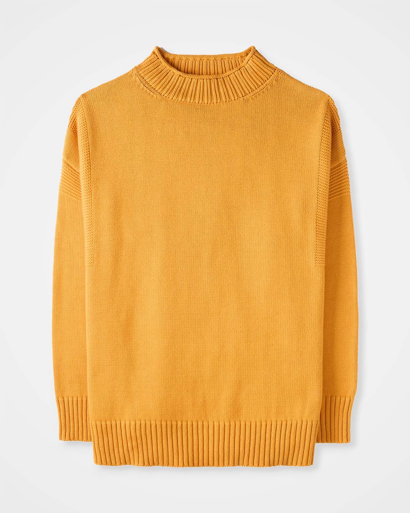Inspired by classic fisherman knits, this gansey jumper has a purl-detailed funnel neck and boxy, drop-shoulder fit. The refined cotton yarn brings softness and breathability, blending heritage design with modern ease for versatile, everyday wear.