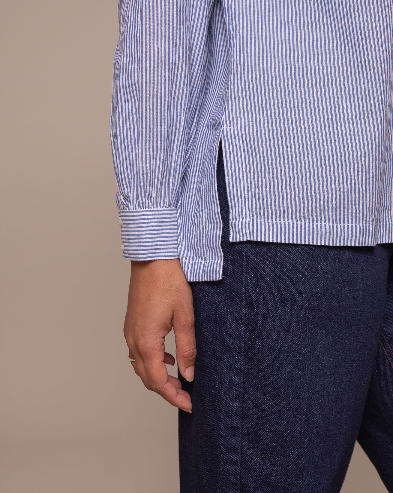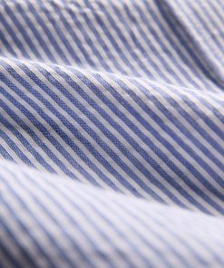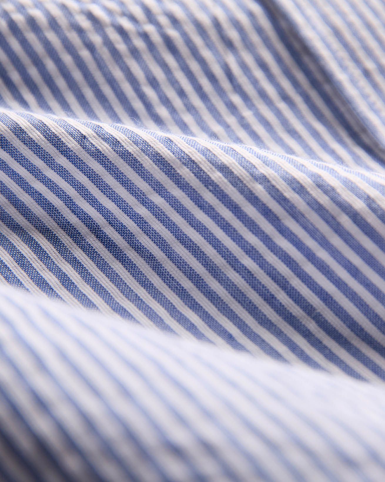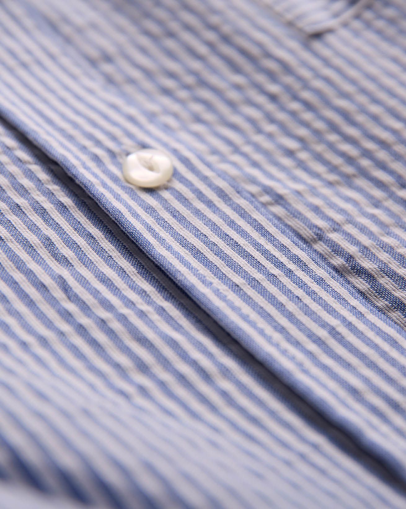 Yarn-dyed narrow stripe fabric with a textured seersucker weave, woven in Portugal. The yarn-dyeing process delivers deep, lasting colour, while the seersucker texture adds natural puckering and breathability.