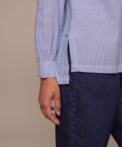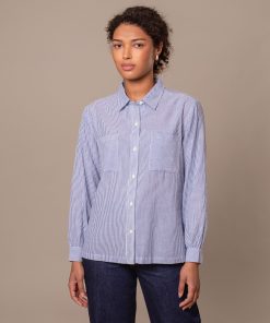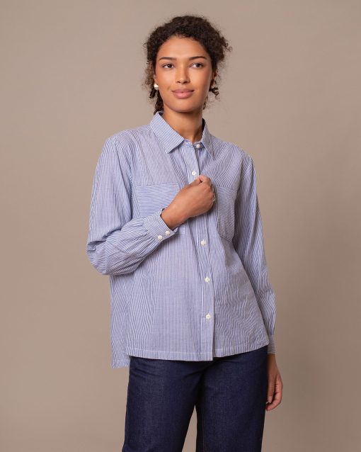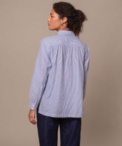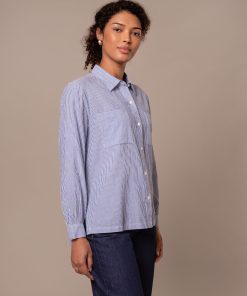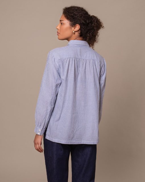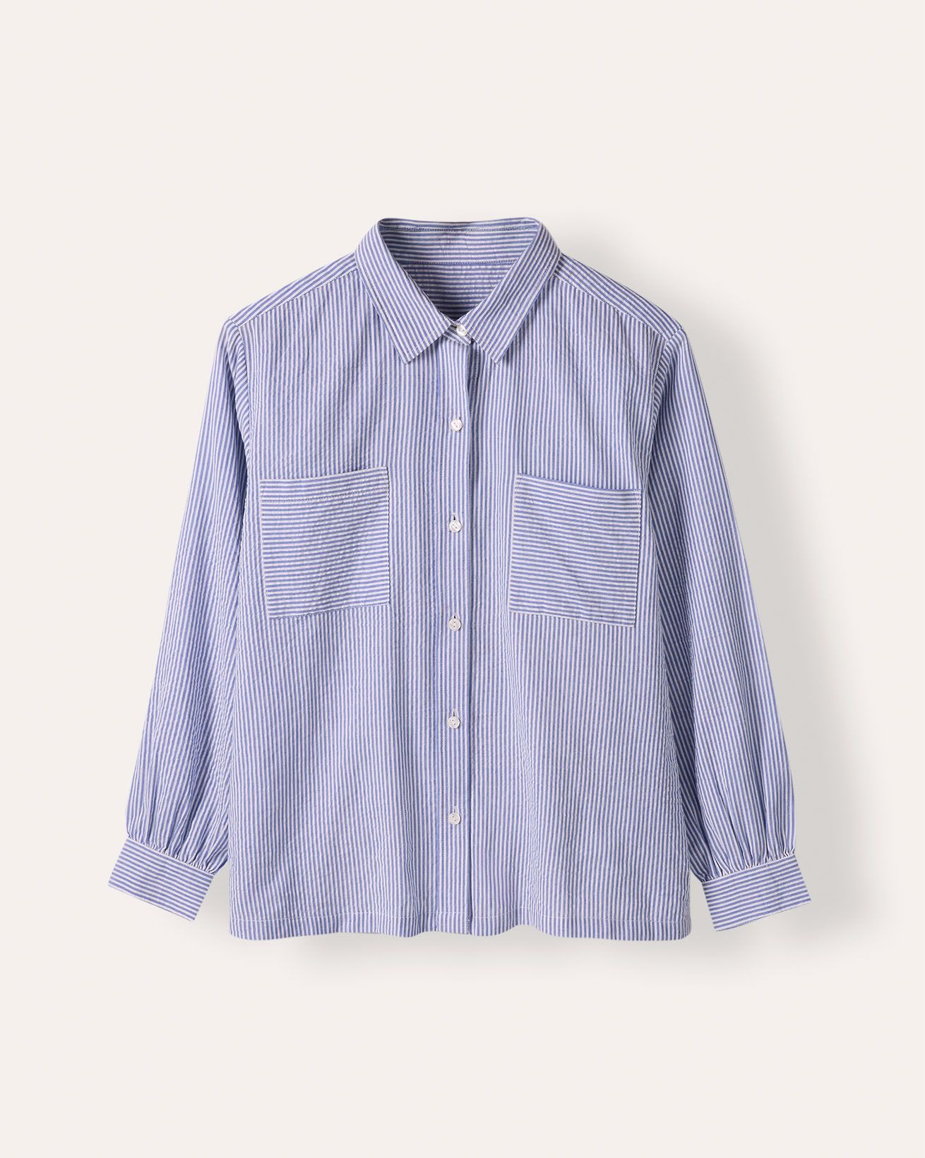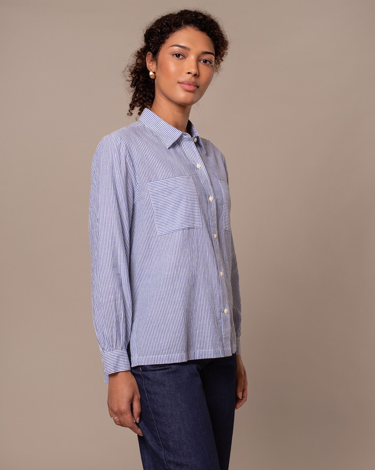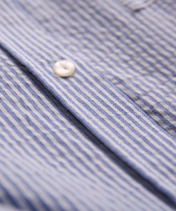 Yarn-dyed narrow stripe fabric with a textured seersucker weave, woven in Portugal. The yarn-dyeing process delivers deep, lasting colour, while the seersucker texture adds natural puckering and breathability.