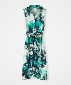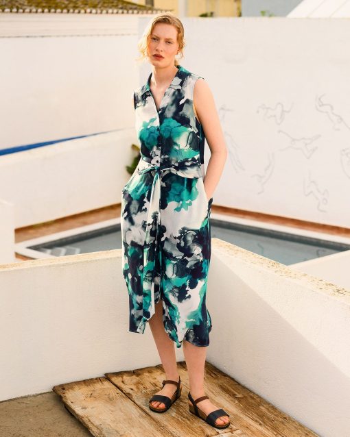 A sleeveless midi dress featuring a collared V-neckline and a self-tie belt for a personalised fit. The gently flared skirt offers a flattering shape, making it a versatile piece ideal for a casual or polished look.