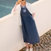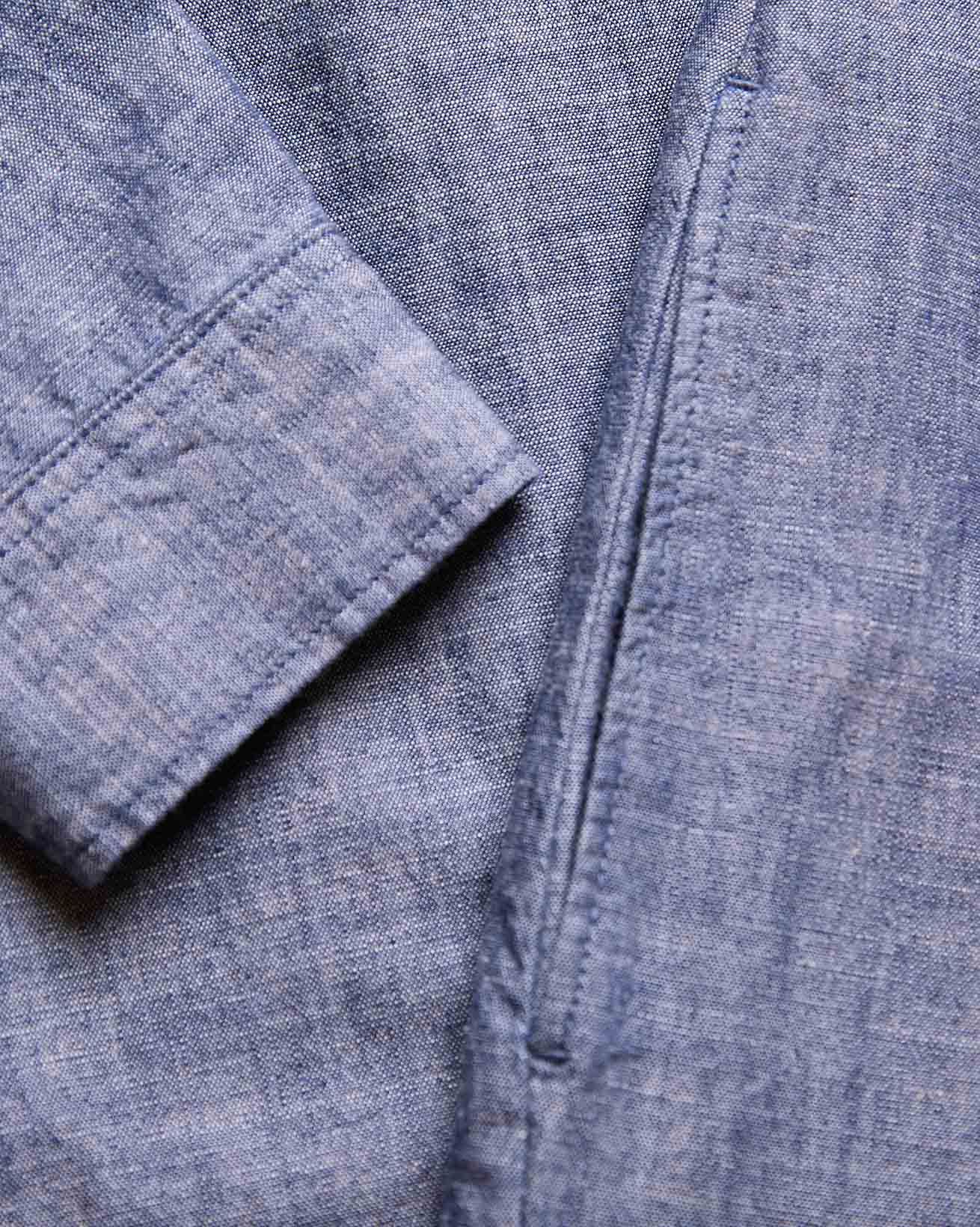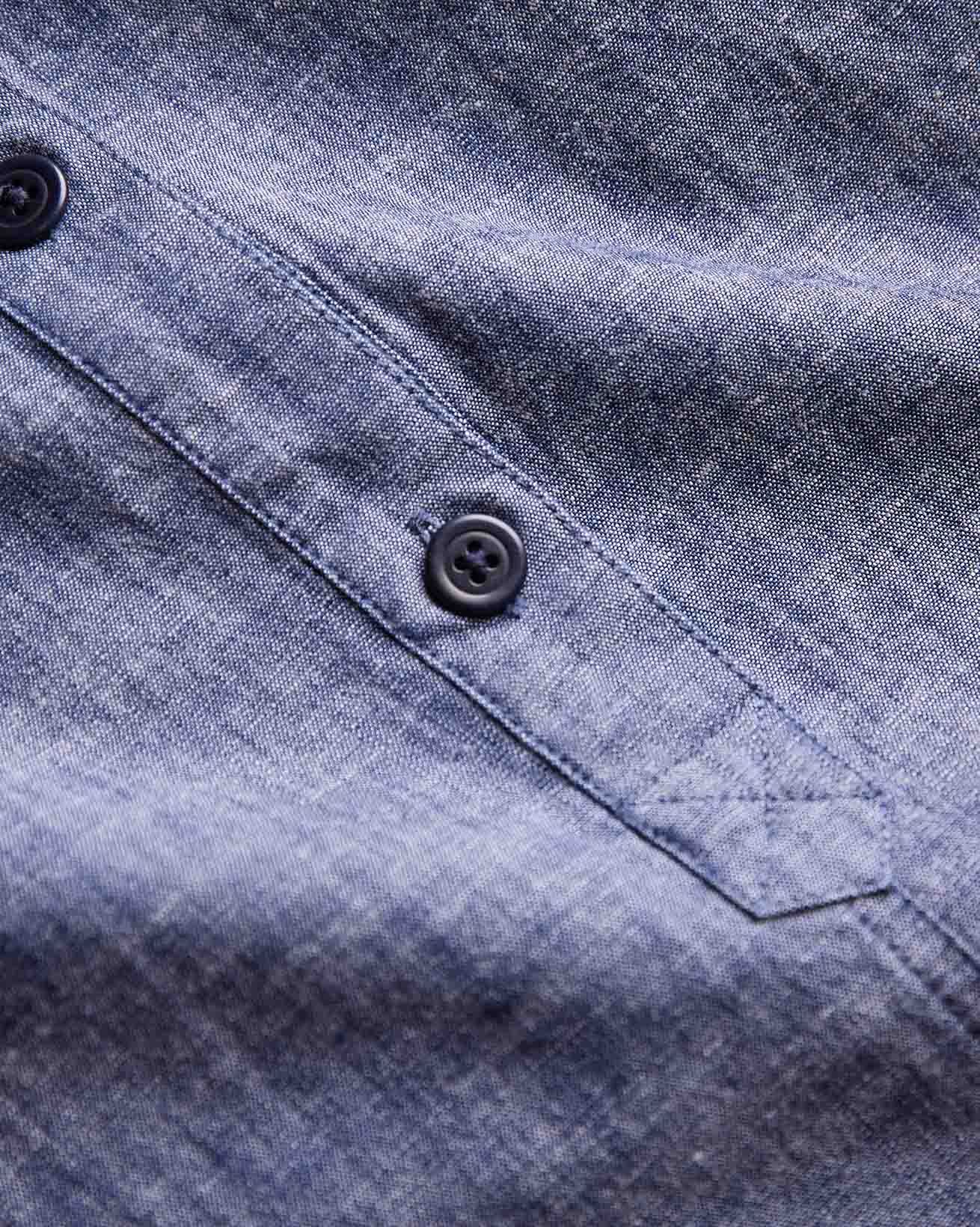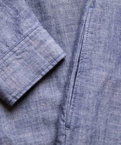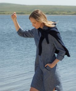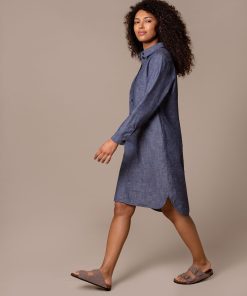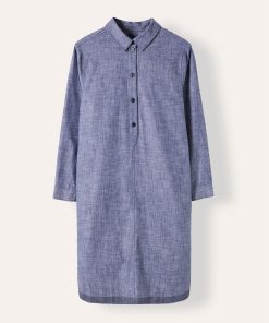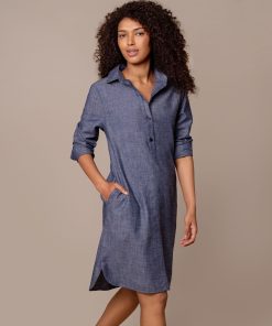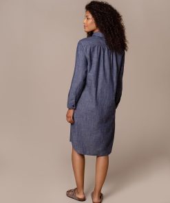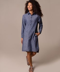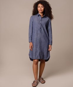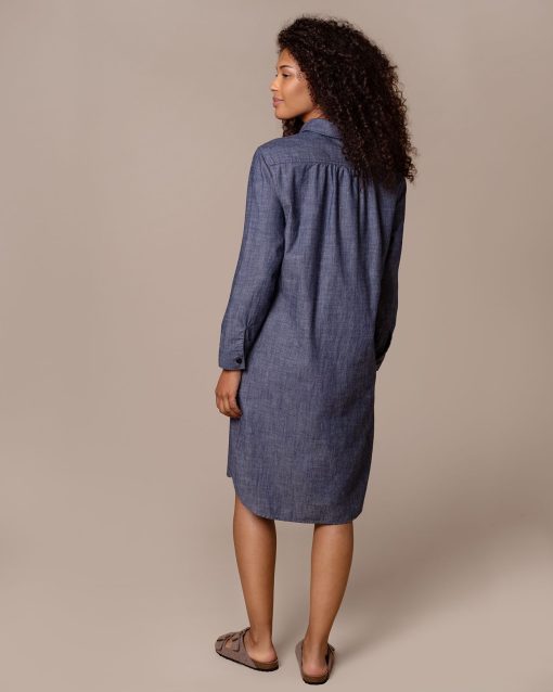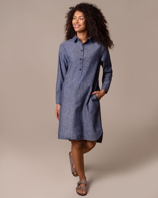 Made from cotton chambray, this knee-length dress features a shirt collar neckline and a half placket with corozo buttons. The indigo-dyed fabric is garment washed for a soft, lived-in feel, offering an easy everyday option with a clean finish.