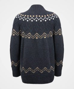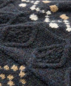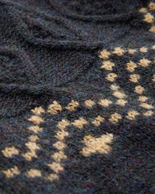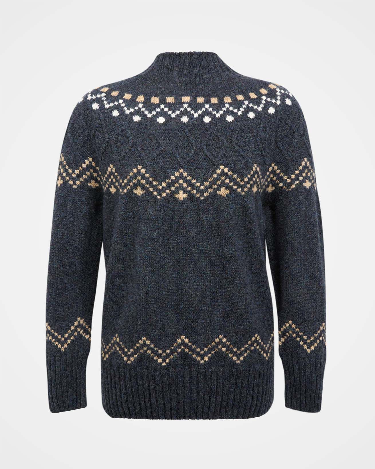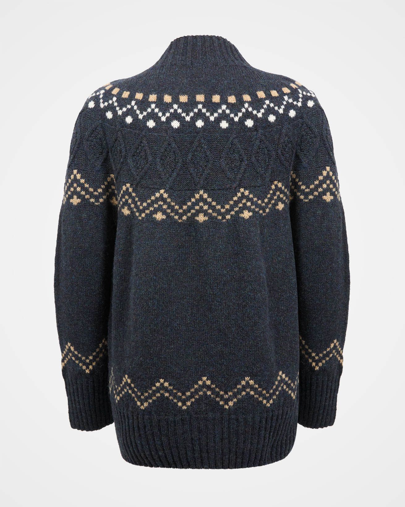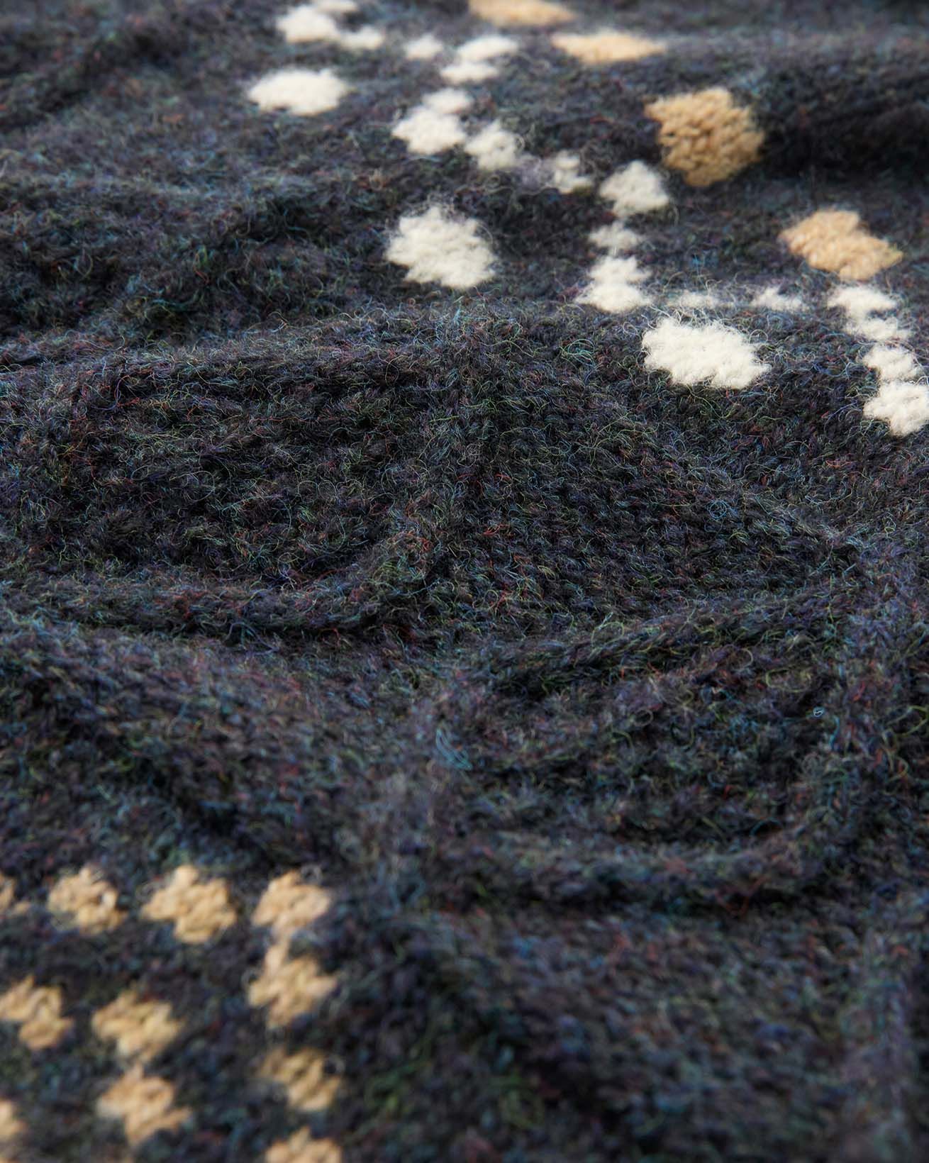 Knitted seamlessly in a combination of different coloured yarns, this slouchy jumper has a casual, loose fit. We’ve opted for a modern take on a traditional Fair Isle yoke jumper with large scale zig zag stitch patterns and diamond elements. The zig zag stitch is repeated near the hem and cuffs, making this a more subtle autumnal take on a classic design. Details include a ribbed mock neck collar and ribbed hem and cuffs.