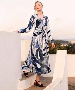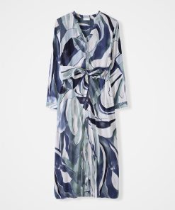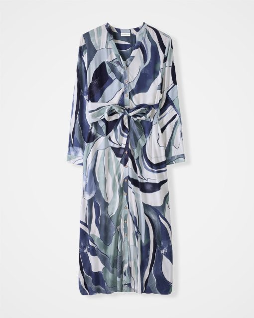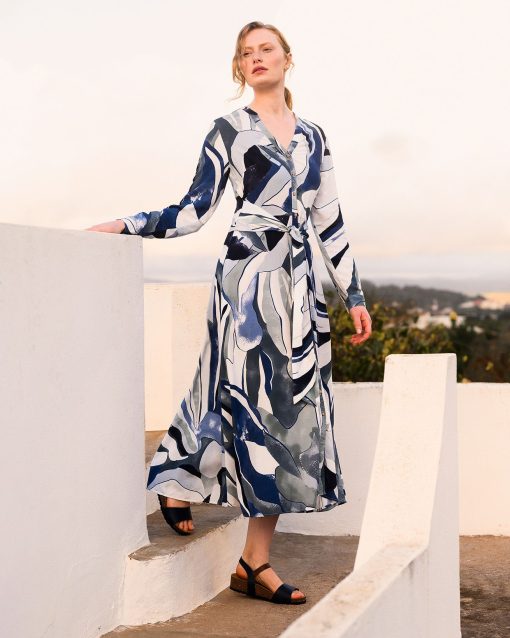 Made from a light and airy fabric that drapes beautifully, this button through midi dress has a full, flowing skirt. It can be tied at the front or back, and features a v-neckline with stand collar detailing, and long sleeves with cuff and button fastenings.