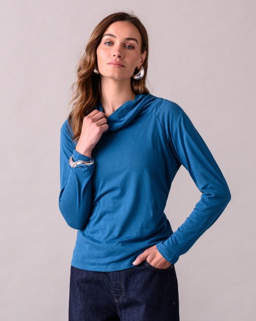 Crafted from a wool and cotton blend jersey with a luxurious finish that is super soft and slightly fluffy. We’ve added a double layer, modest cowl neckline that’ll keep you incredibly cosy, plus long raglan sleeves. This item is great for layering under jumpers, cardigans, knits and woven dresses, or worn as a standalone piece.